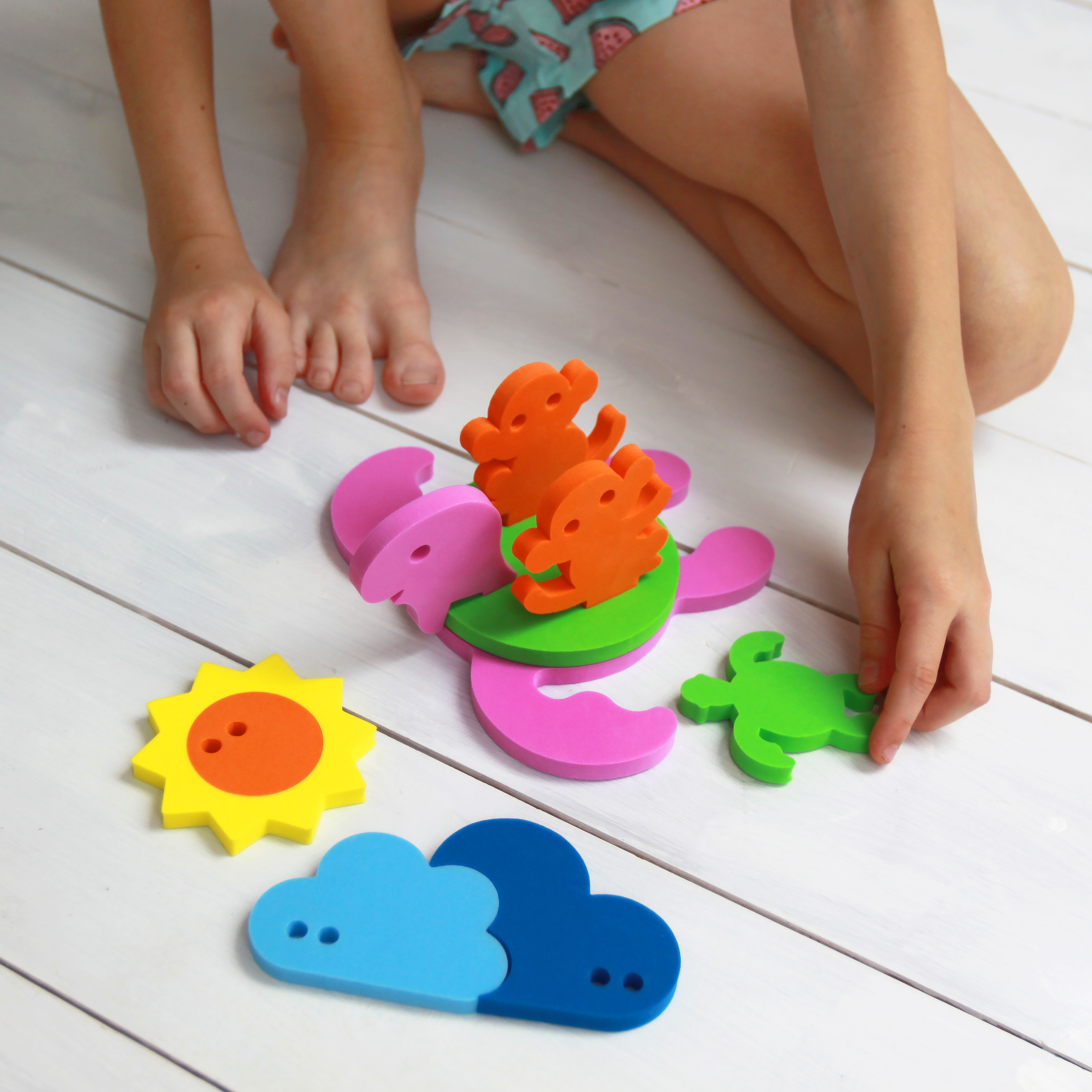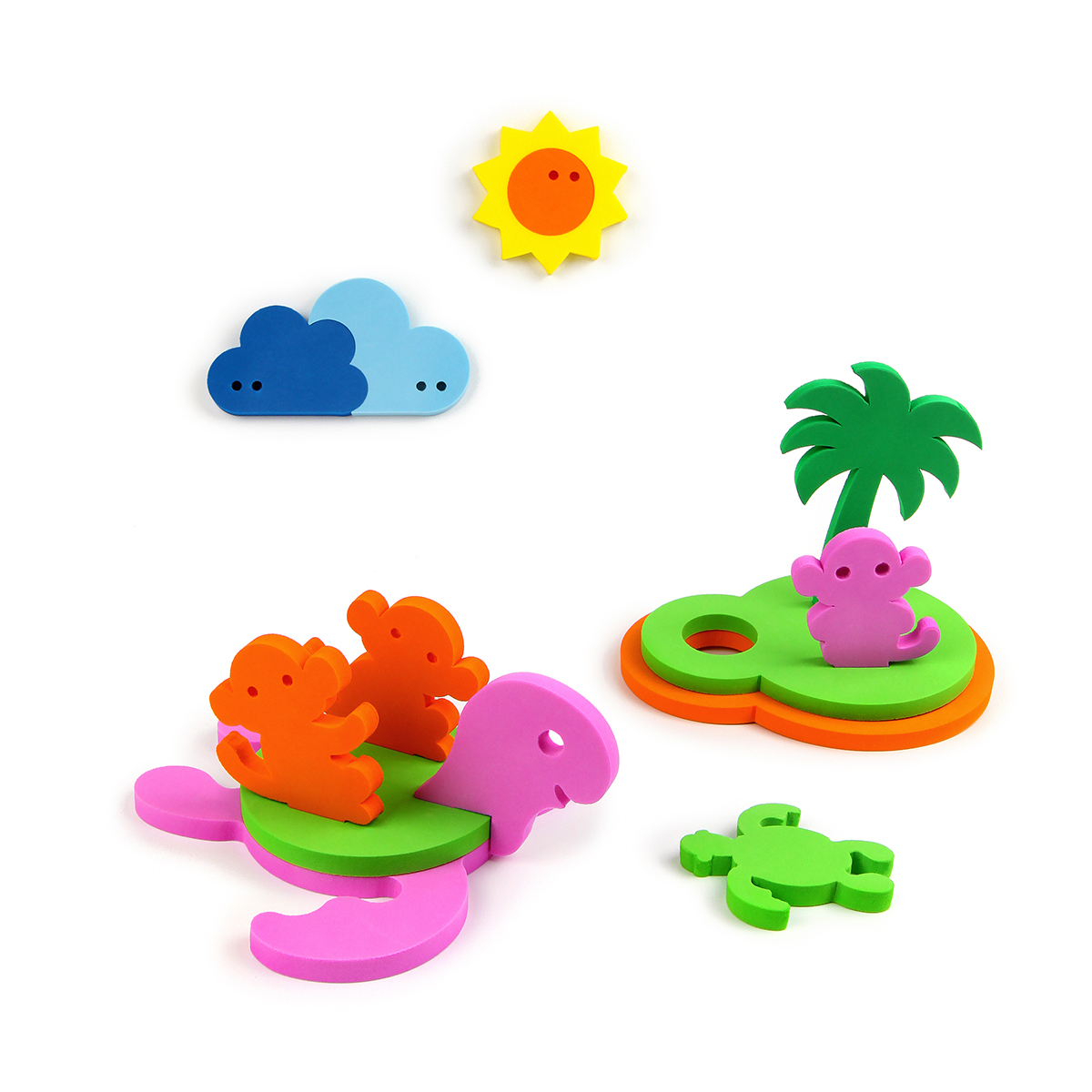 Конструкторы в виде тропического острова и веселых животных, которые малыш легко сможет собрать самостоятельно. Конструктор выполнен из высококачественного безопасного материала ЭВА, который не боится воды, солнца, песка и загрязнений. Остров и черепахи устойчиво держатся на воде. Гибкие и мягкие детали фигурок без труда соединяются между собой и хорошо держат форму после сборки. Дополнительные элементы, солнце и облака, смочив водой, можно прикрепить на стену или бортик ванной — получится целый сюжет для игр. В процессе игры развивается мышление, логика, внимательность и воображение. Конструктор превратит купание в веселый и творческий процесс.
