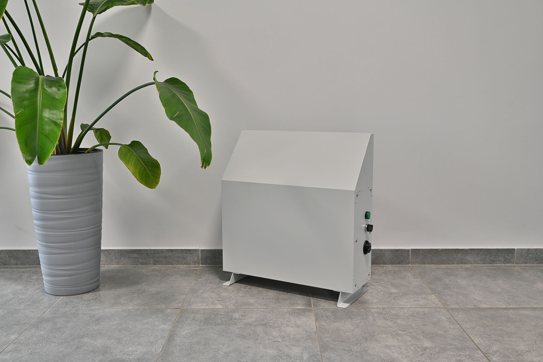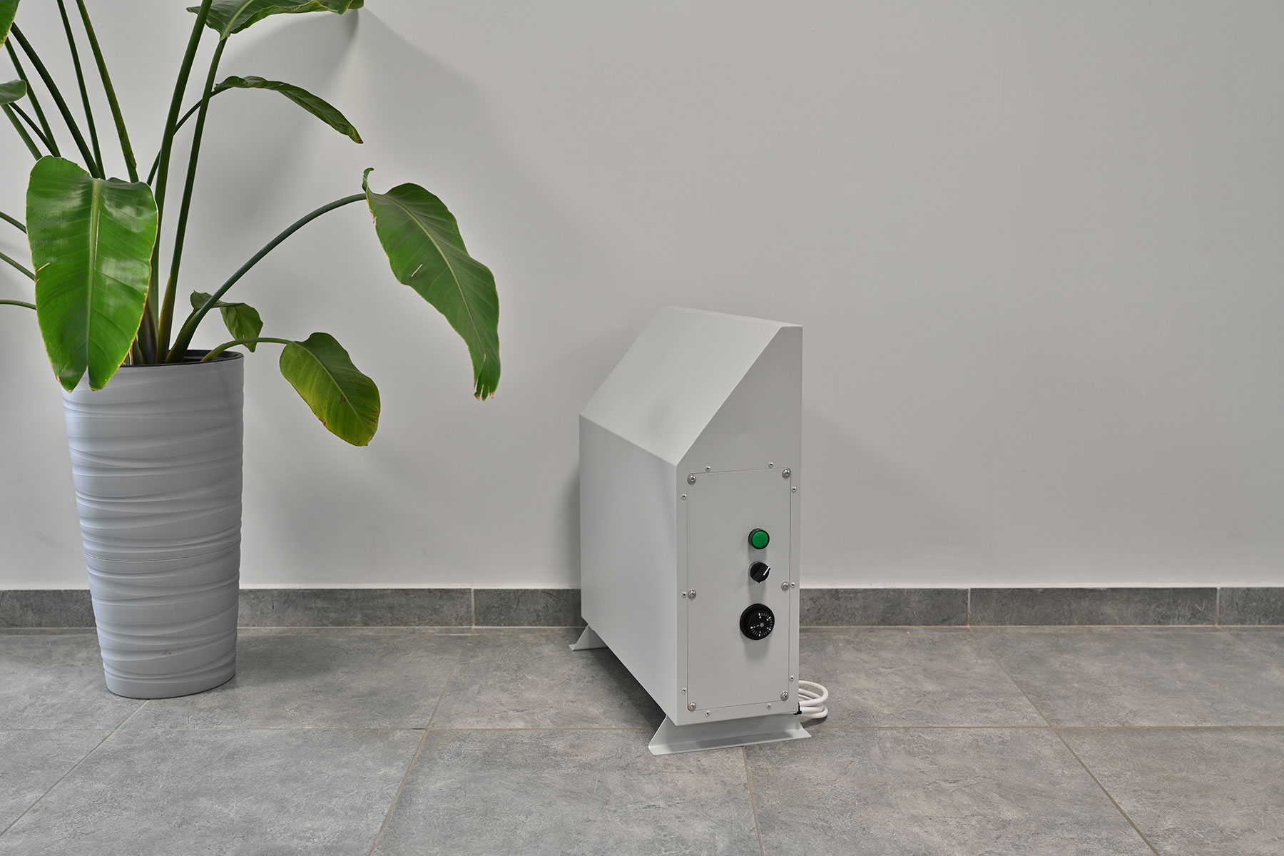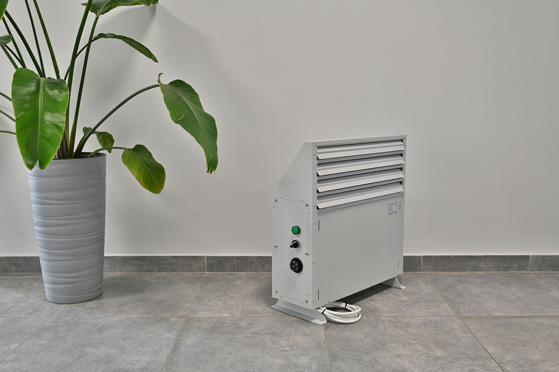 Конвектор состоит из прочного стального корпуса с полимерным покрытием RAL 7035, устойчивым к коррозии и механическим повреждениям. Внутри корпуса расположен нагревательный элемент с увеличенной поверхностью теплообмена, обеспечивающий высокую эффективность передачи тепла.