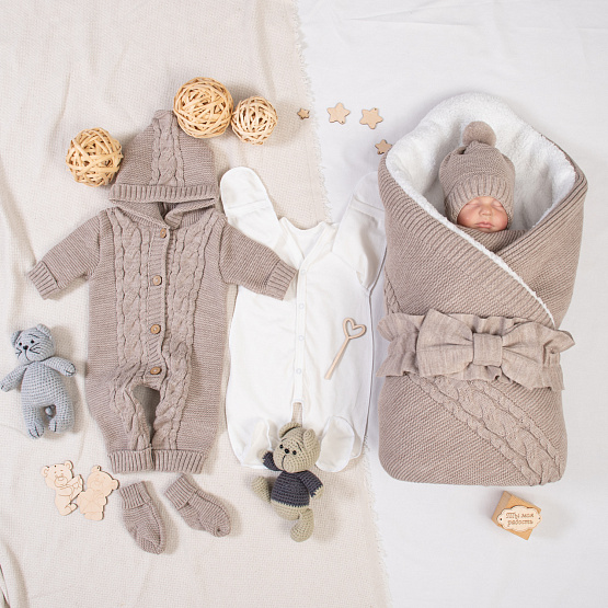 Комплект на выписку из вязанного полотна, внутри мерлушка, одеяло утеплено холстоном.