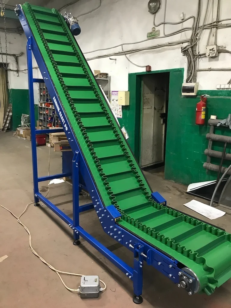 - Наклонная конструкция — позволяет транспортировать грузы на разную высоту, оптимизируя логистику на производстве.