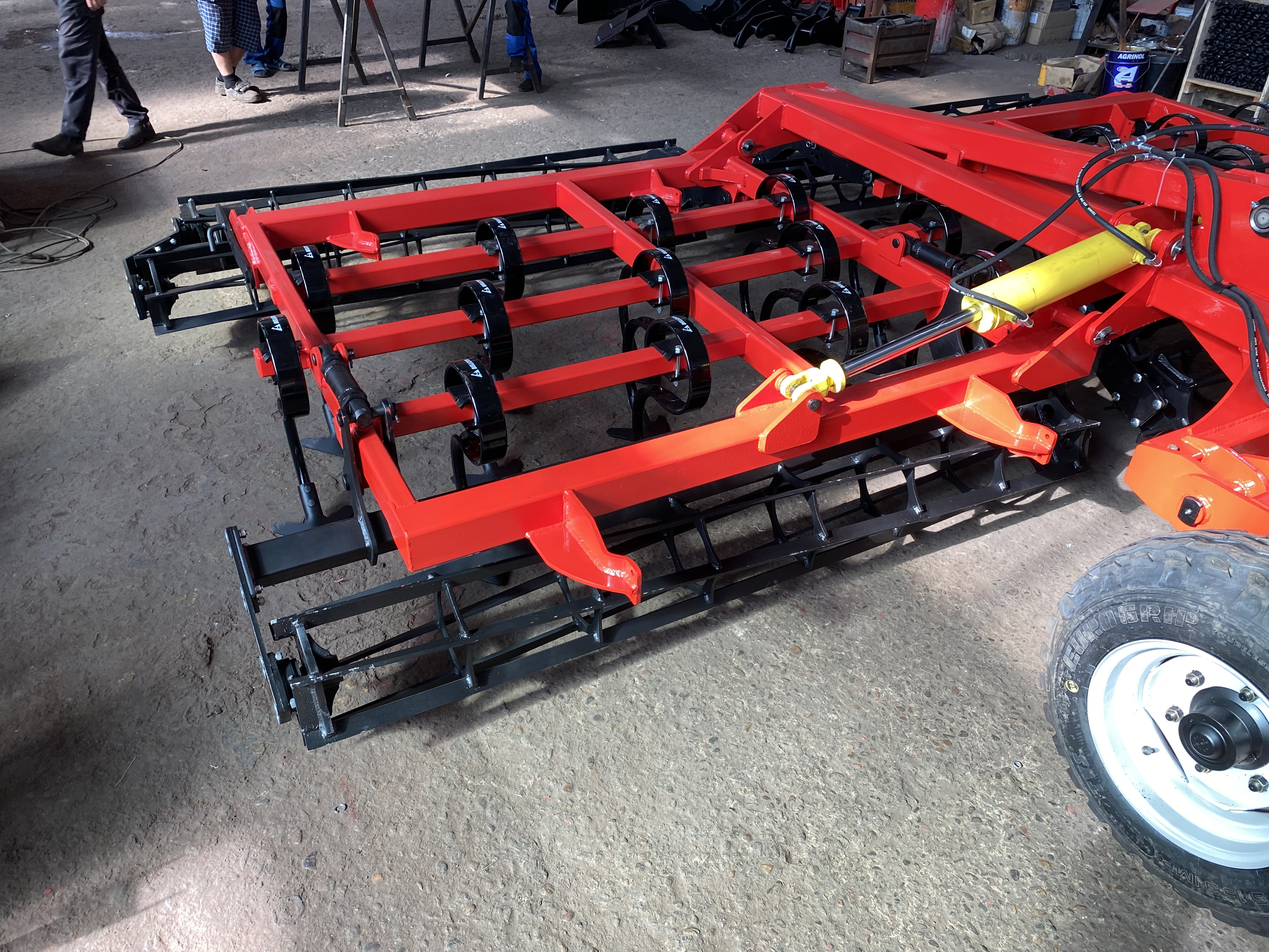 Опционально, вместо выравнивателя и опорных колес впереди может устанавливаться опорно-выравнивающий планчатый каток. Регулировка глубины обработки осуществляется перестановкой пальцев в отверстиях. Как на передних, так и на задних катках.