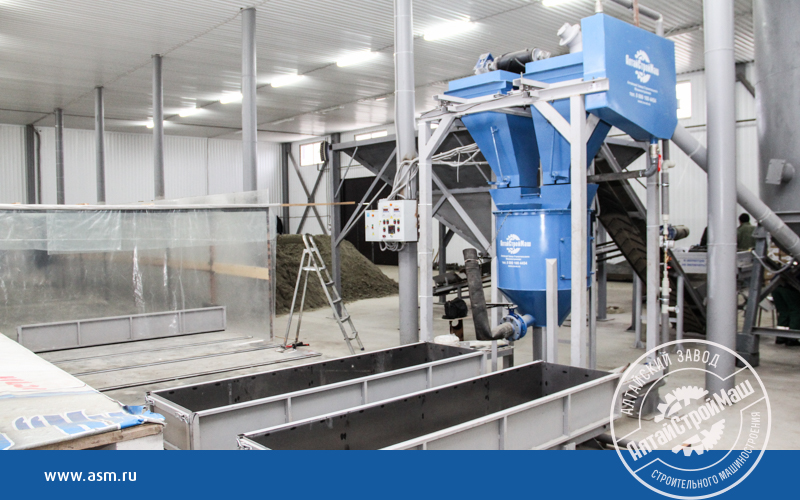 Линия состоит из неподвижно стоящего смесителя-активатора, блока дозаторов с электронным весовым терминалом, ленточного и шнекового транспортера для сырья, толкателей и резательной установки. Можно выбрать механизированный вариант реза на блоки или полностью автоматический с ЧПУ.