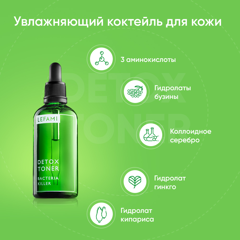 Несмываемый очищающий лосьон тоник для кожи лица DETOX TONER - проверенное средство для борьбы от прыщей и акне на лице и теле. Тоник для лица для жирной и комбинированной кожи - профессиональная уходовая российская косметика от прыщей и постакне. Самое эффективное средство от прыщей на лице для подростков быстро приведет в порядок кожные покровы, придаст лицу здоровое сияние и гладкость. Средство от прыщей на лице у взрослых станет секретным оружием в борьбе за идеальную внешность. Лосьон анти акне для проблемной кожи содержит 3 аминокислоты, коллоидное серебро, гидролаты бузины, гинкго, кипарис и витамин С. Витамин С снимает признаки усталости, осветляет покраснения и делает тон свежим. Лосьона для очищения лица для проблемной кожи хватит на 2-3 месяца регулярного использования. Лосьон от прыщей для жирной кожи используется утром и вечером. Тоник против прыщей создает невидимый барьер на коже. Очищающий тоник для проблемной кожи против черных точек защитит от микробов.