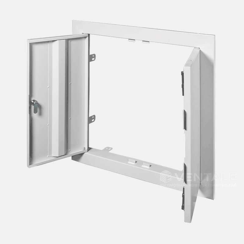Люк ревизионный металлический усиленный Ventale из стали 1 мм. Особенности модели: усиленная конструкция ревизионного люка с увеличенной до 1 мм толщиной используемой стали. Замковая модель ревизионного сантехнического люка, дверка фиксируется за счет 2-х цилиндровых (почтовых) замков. Двери люка усилены ребрами жесткости. Увеличенный до 50 мм наличник люка позволяет скрывать огрехи финишной отделки по периметру монтажного проема. Для удобства монтажа предусмотрены монтажные пластины по периметру рамы. Оптимальная модель для изделий увеличенных размеров. Для чего: используется для маскировки инженерных коммуникаций, которые необходимо эстетично скрыть, но при этом ограничить доступ. Чаще всего устанавливается в местах общего пользования с повышенными требованиями к прочности ревизионных люков. Обеспечивает легкий и удобный доступ для регулярной ревизии коммуникаций. Из чего: изготавливается из холоднокатанной стали методом раскроя на станке лазерной резки, детали гнутся на листогибочном прессе с ЧПУ, собирается контактной или полуавтоматической сваркой, с последующей полимерной порошковой покраской.