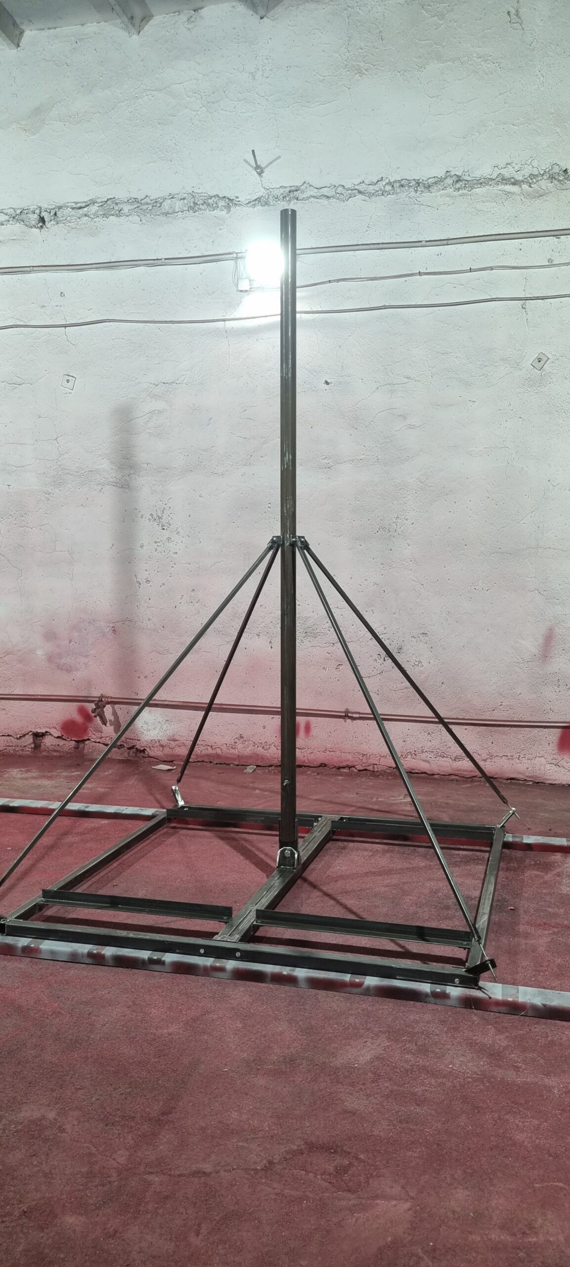 Антенно-мачтовое сооружение данного типа представляет собой пригруженную опору предназначенную для подъема антенных устройств различного назначения общей массой не более 15 кг на высоту до 12 м. Мачта состоит из полностью разборного основания, от 2000х2000 до 4000х4000 мм, (в зависимости от высоты ствола), служащего в качестве пригруза и упора ствола, а так же штанг-растяжек. Ствол мачты для антенны состоит из отдельных трубчатых секций длиной 3 м, которые выполнены из стальной тонкостенной трубы диаметром 76 мм. Отличительной особенностью данного типа антенных опор является их мобильность, простота в установке, полностью разборное (мобильное) основание и минимально занимаемое место на устанавливаемой площади. Ствол опоры держат четыре металлические штанги-растяжки, опирающиеся в углы опоры. Верхняя секция, в зависимости от высоты и устанавливаемого оборудования, закрепляется стальным оцинкованным канатом диаметром 6 мм. Оттяжки опоры крепятся так же к углам основания, что исключает дополнительные работы по монтажу опоры.