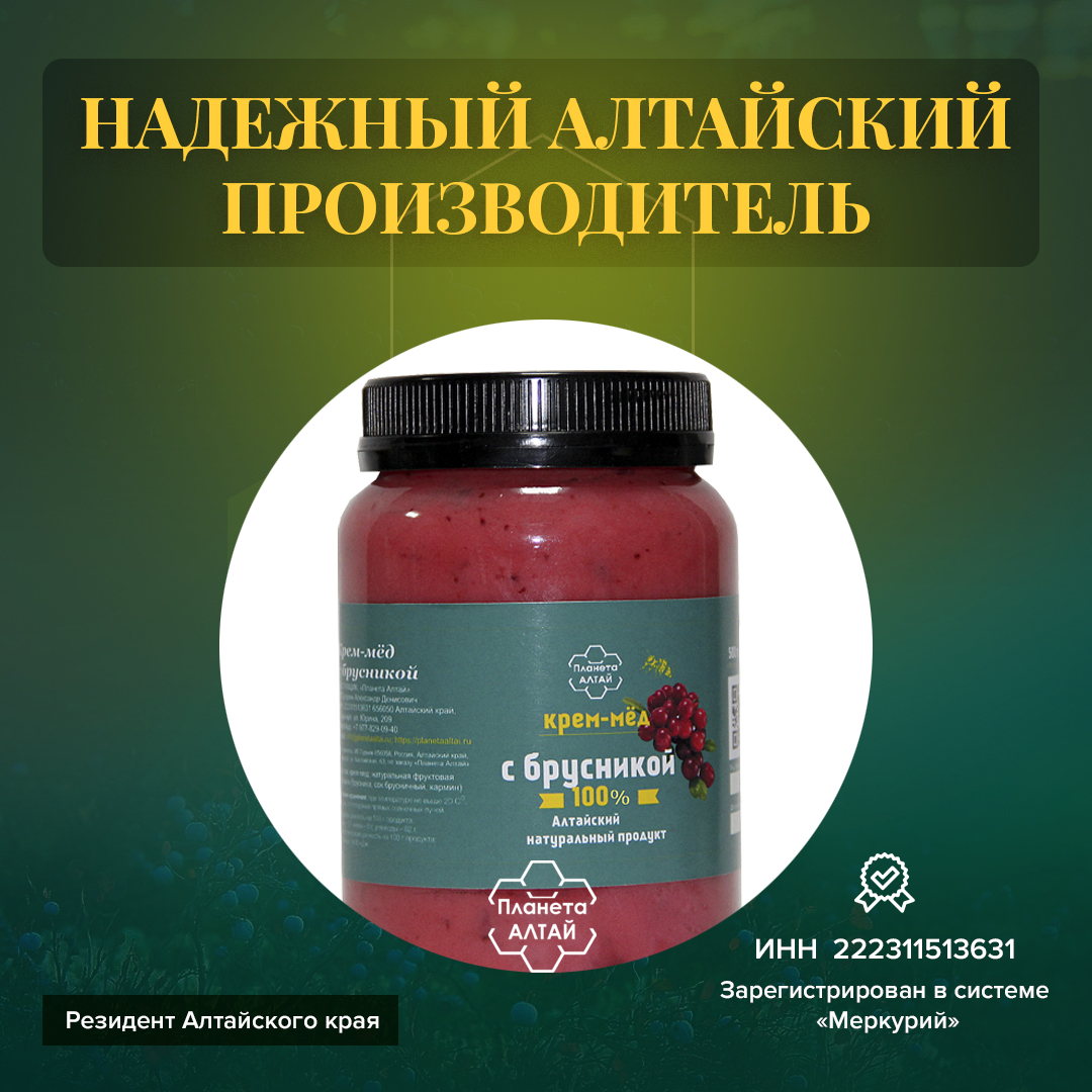 Взбитый мёд ТМ «Планета Алтай», который мы производим, не содержит в себе усилителей вкуса, ароматизаторов, сахара и прочего «бутора». Здесь они просто не требуются, потому что натуральные ягоды брусники дают потрясающий вкус и аромат, и являются природным источником витаминов и микроэлементов.
