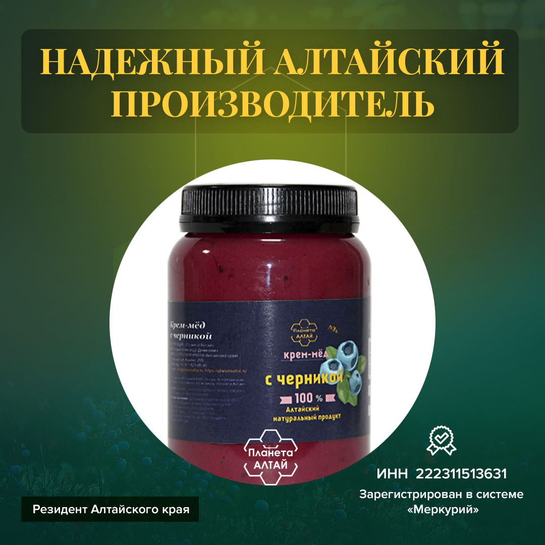 Крем - мед «Планета Алтай» содержит лучшие сорта Алтайского мёда и исключительно натуральные ягоды черники, выращенные на Алтае и в Сибири. Именно Алтайский мед славится тем, что на 1 гектар площадей приходится до 25-и дикорастущих цветковых растений. Это самый высокий показатель в России. А значит и вкусовых оттенков в Алтайском взбитом меде с черникой будет огромное количество.