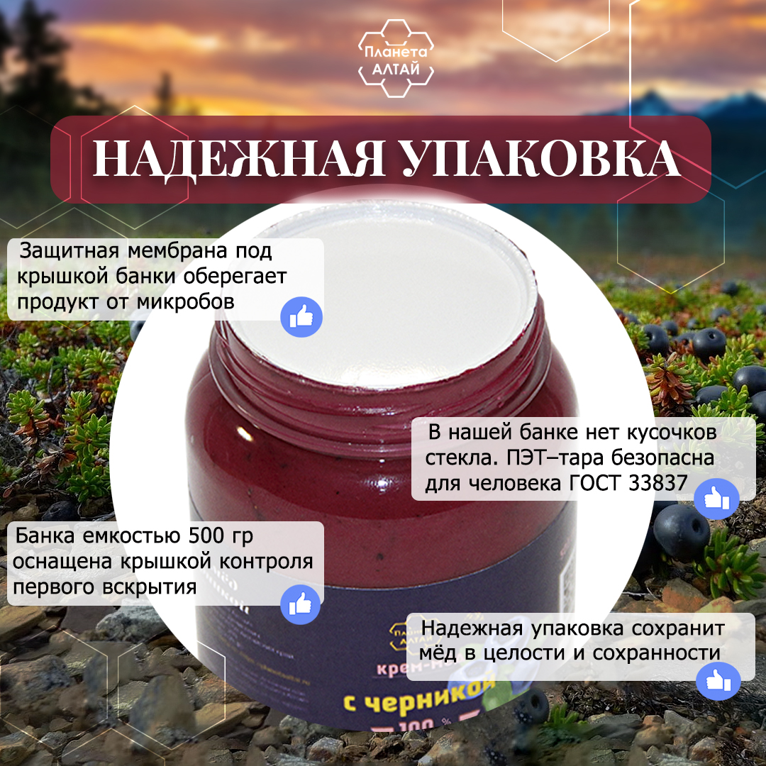 Взбитый мёд ТМ «Планета Алтай», который мы производим, не содержит в себе усилителей вкуса, ароматизаторов, сахара и прочего «бутора». Здесь они просто не требуются, потому что натуральные ягоды черники дают потрясающий вкус и аромат, и являются природным источником витаминов и микроэлементов.