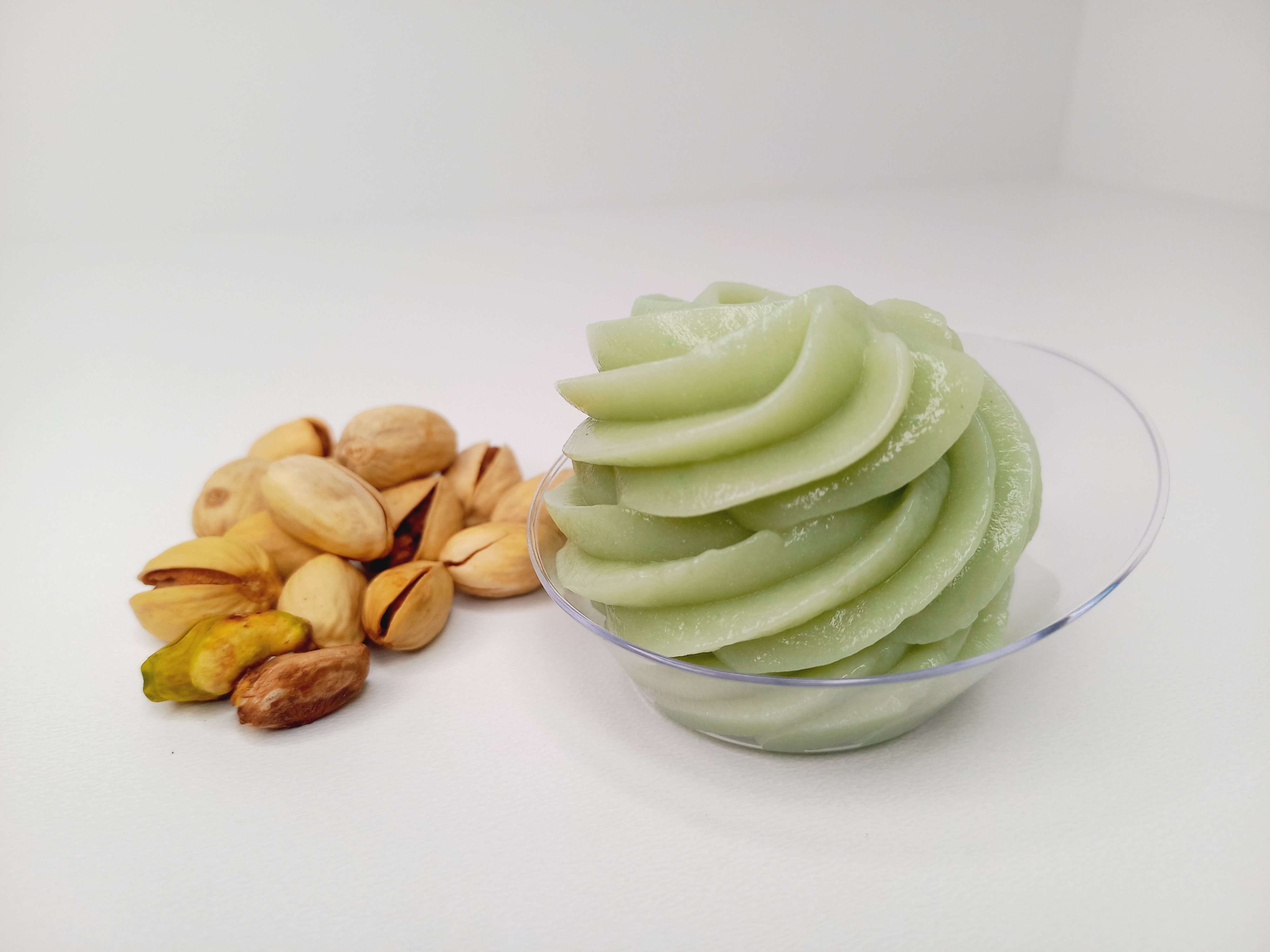 Крем светло-зеленного цвета, со сладким, чистым вкусом фисташки.