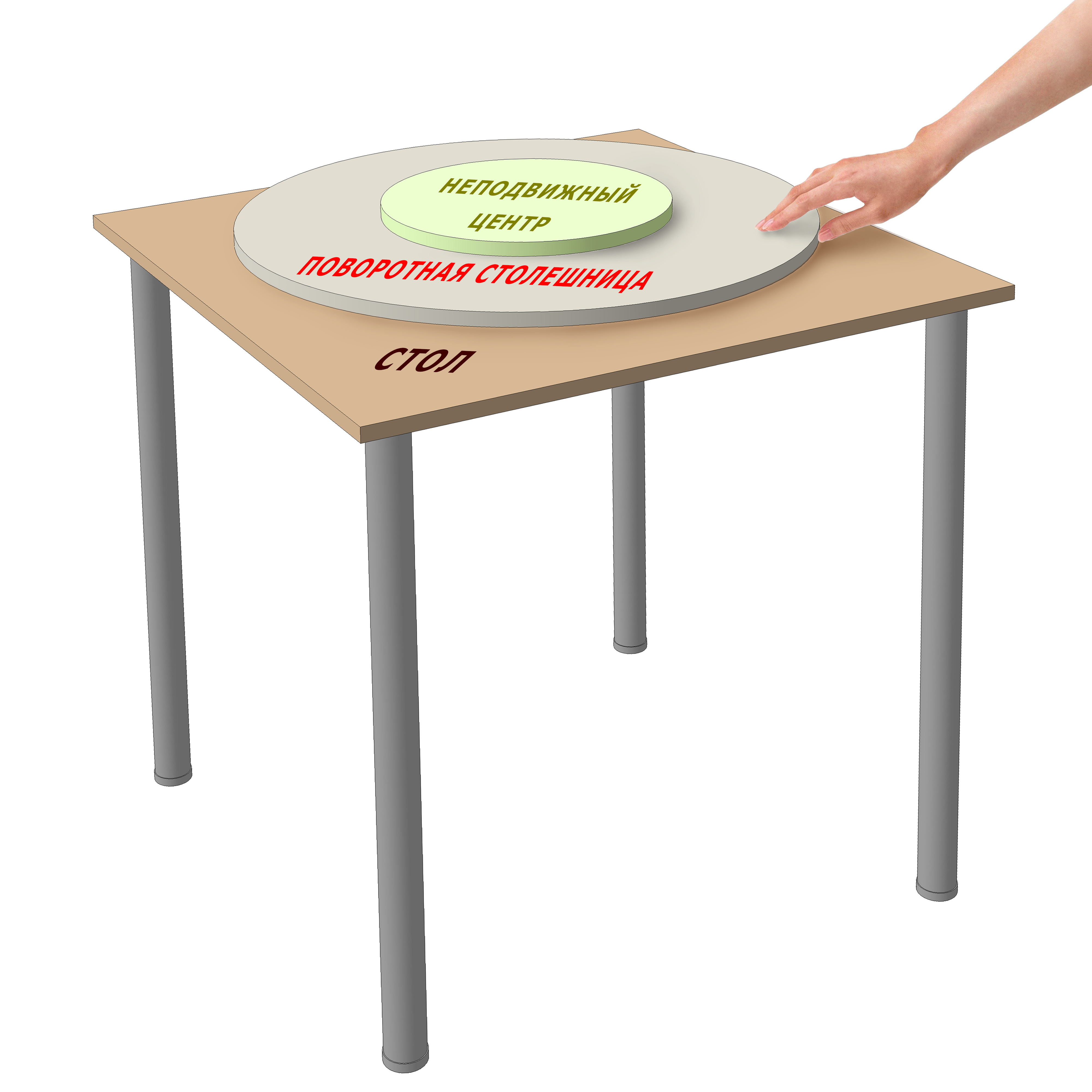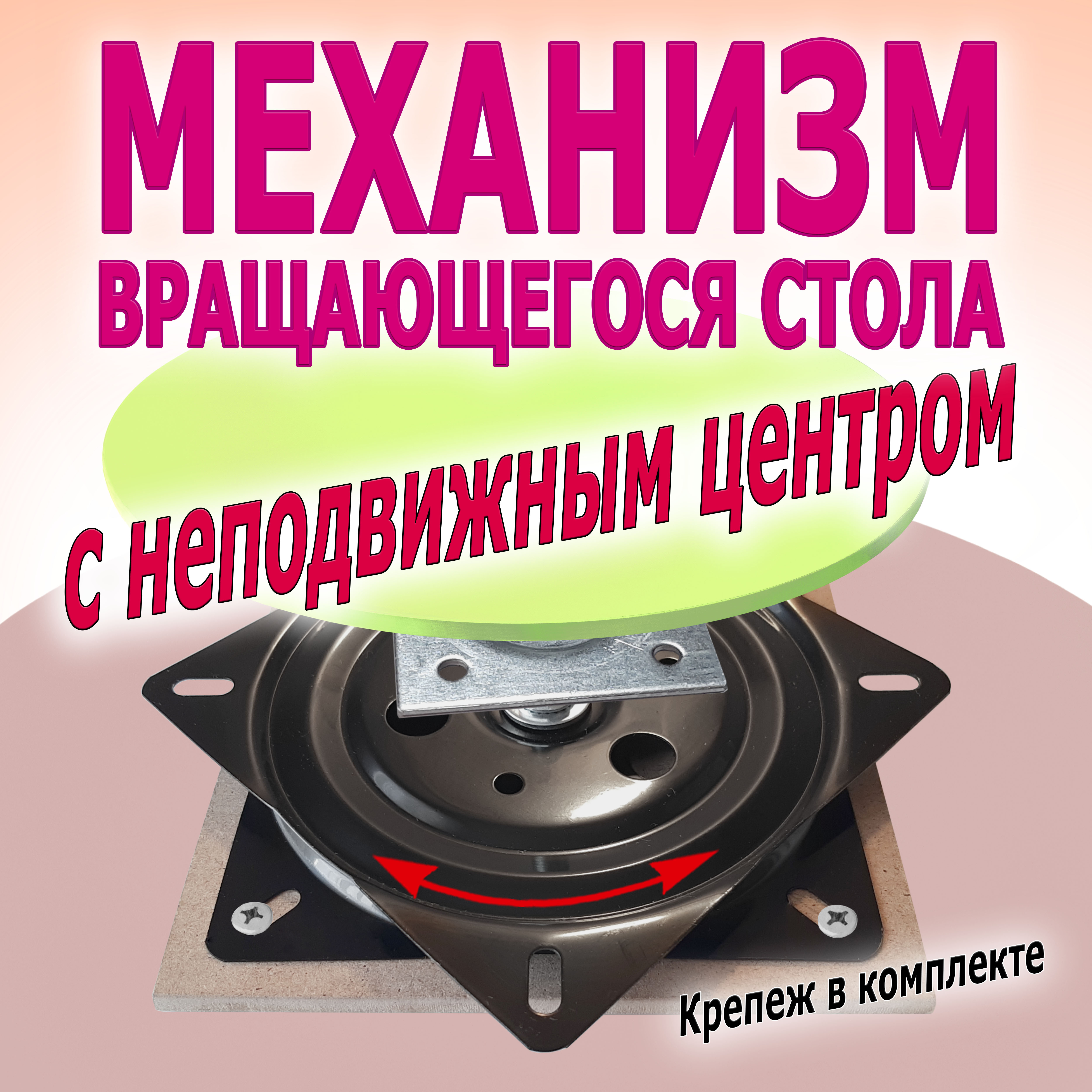 Комплект деталей позволит вам собрать крутящийся стол со съемным неподвижным центром. Форма поворотной столешницы, неподвижного центра и стола может быть разная: круг, квадрат, восьмиугольник. Рекомендованный размер поворотной столешницы: от 30 см до 60 см. Рекомендованный размер неподвижного центра от 10 до 30 см. Рекомендуемая толщина поворотной столешницы: 15-18 мм. Допустимая нагрузка на поворотную столешницу: до 20 кг, на неподвижный центр: до 10 кг.