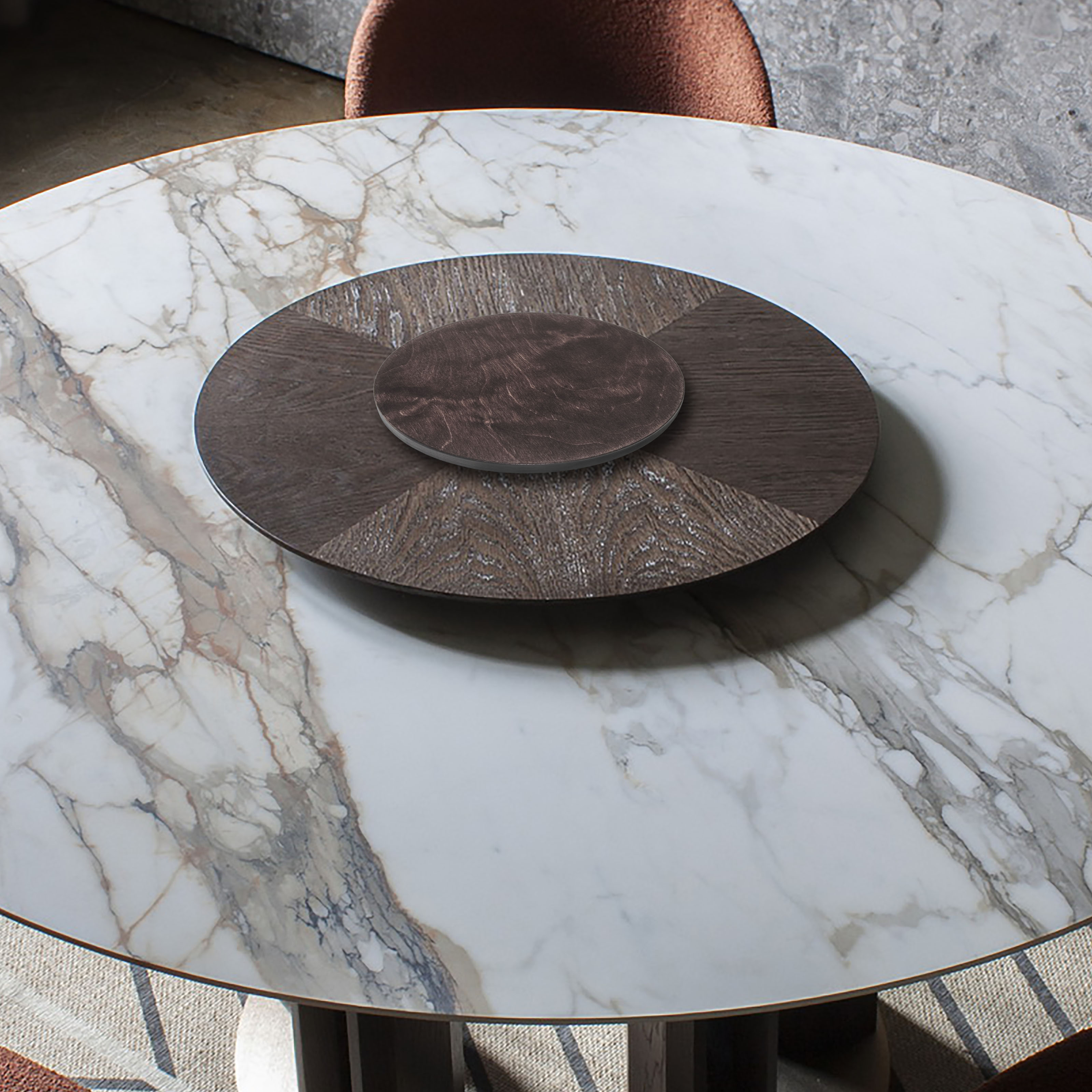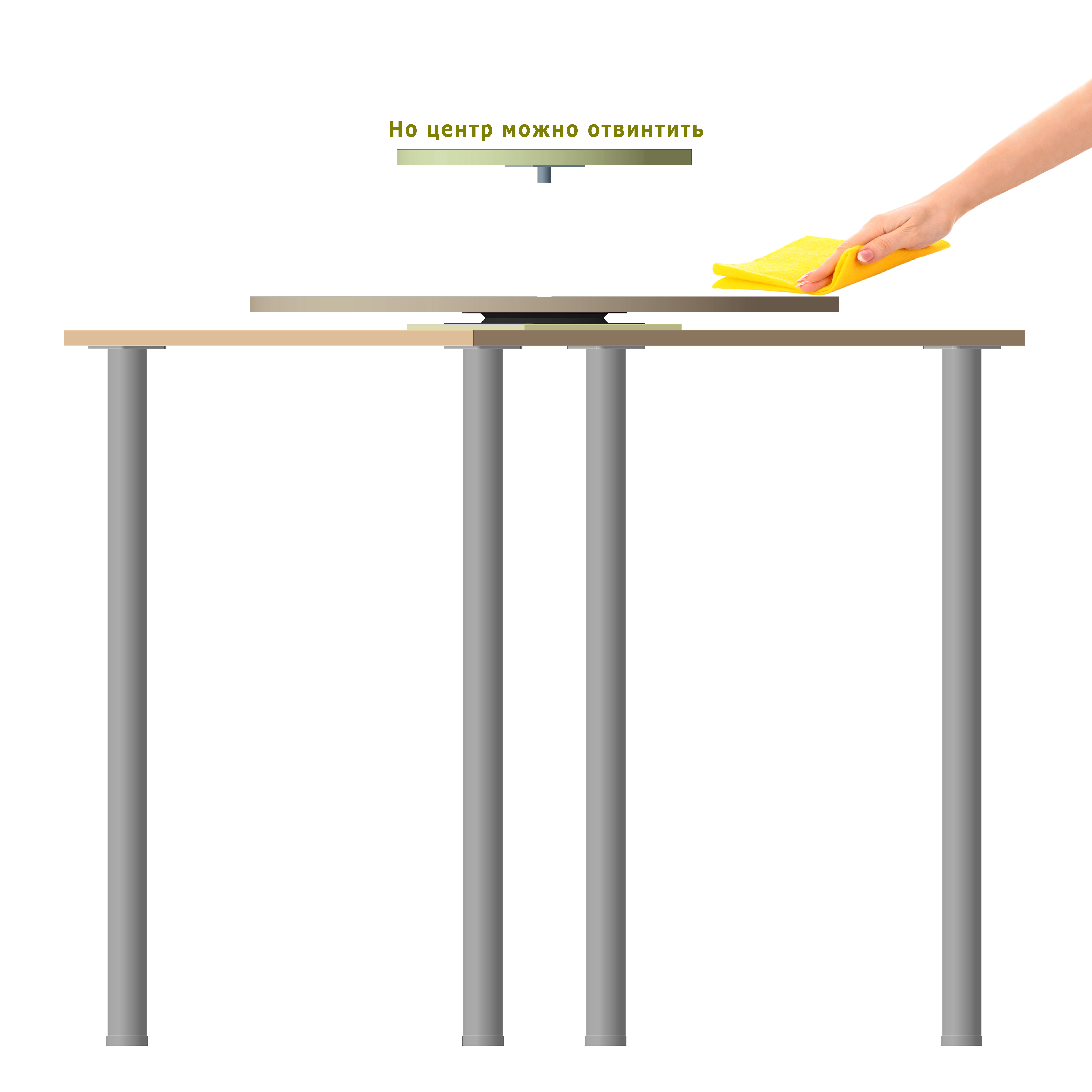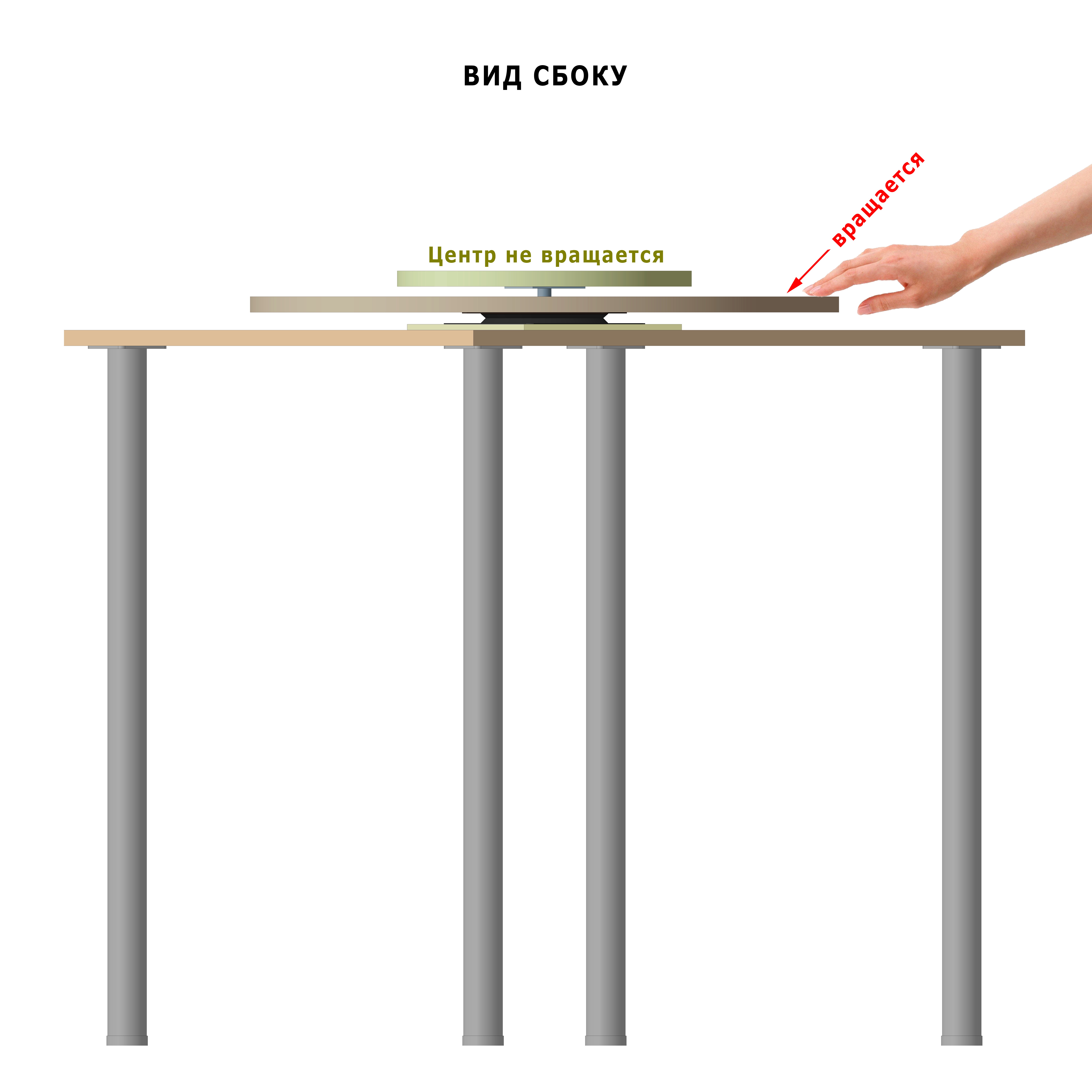 Для сборки поворотного стола удобнее применить готовые круги-столешницы подходящих диаметров. Вы можете приобрести на OZON.ru круглые столешницы нужного цвета из дерева, МДФ, ЛДСП. Основой всей конструкции может служить обычный стол небольшого размера.
