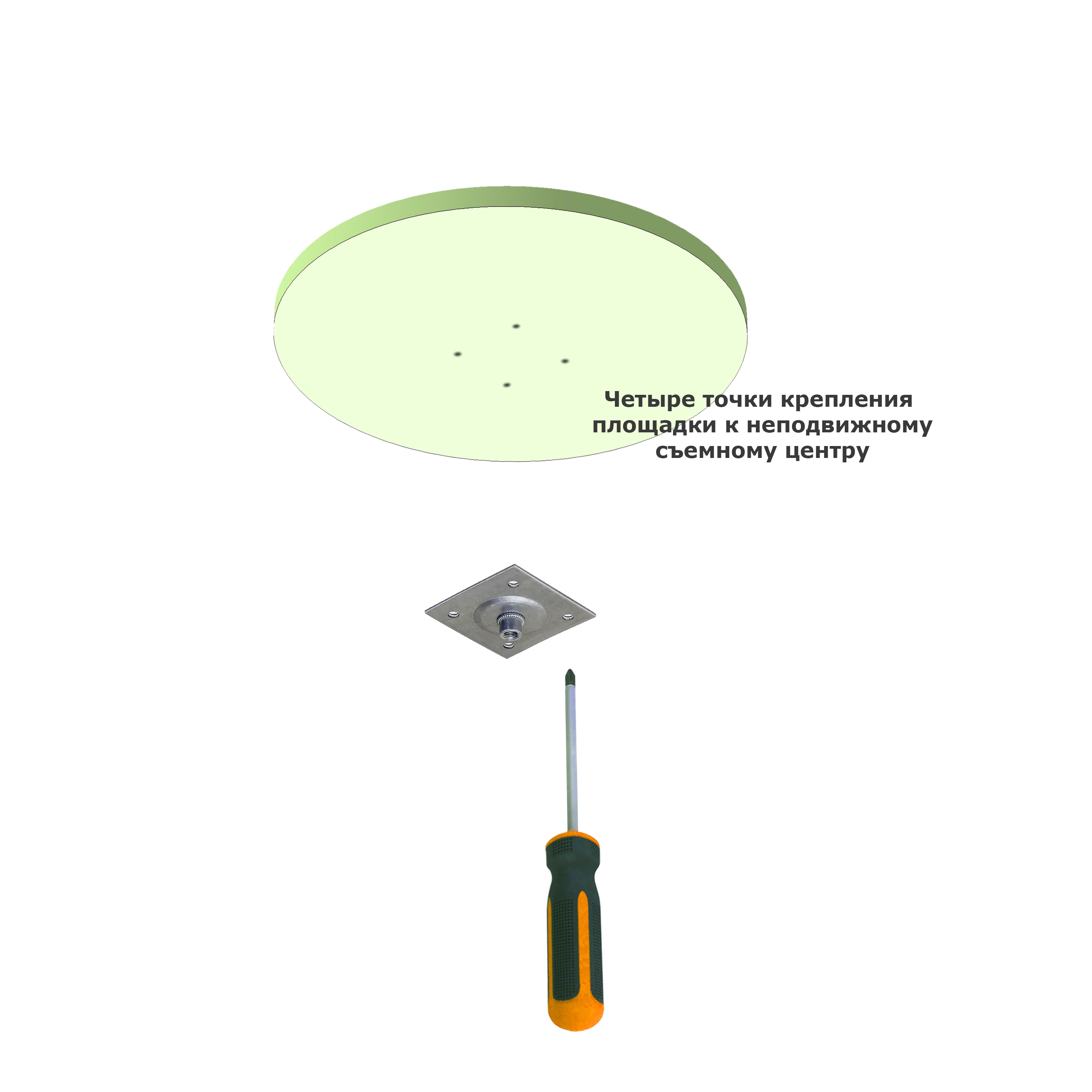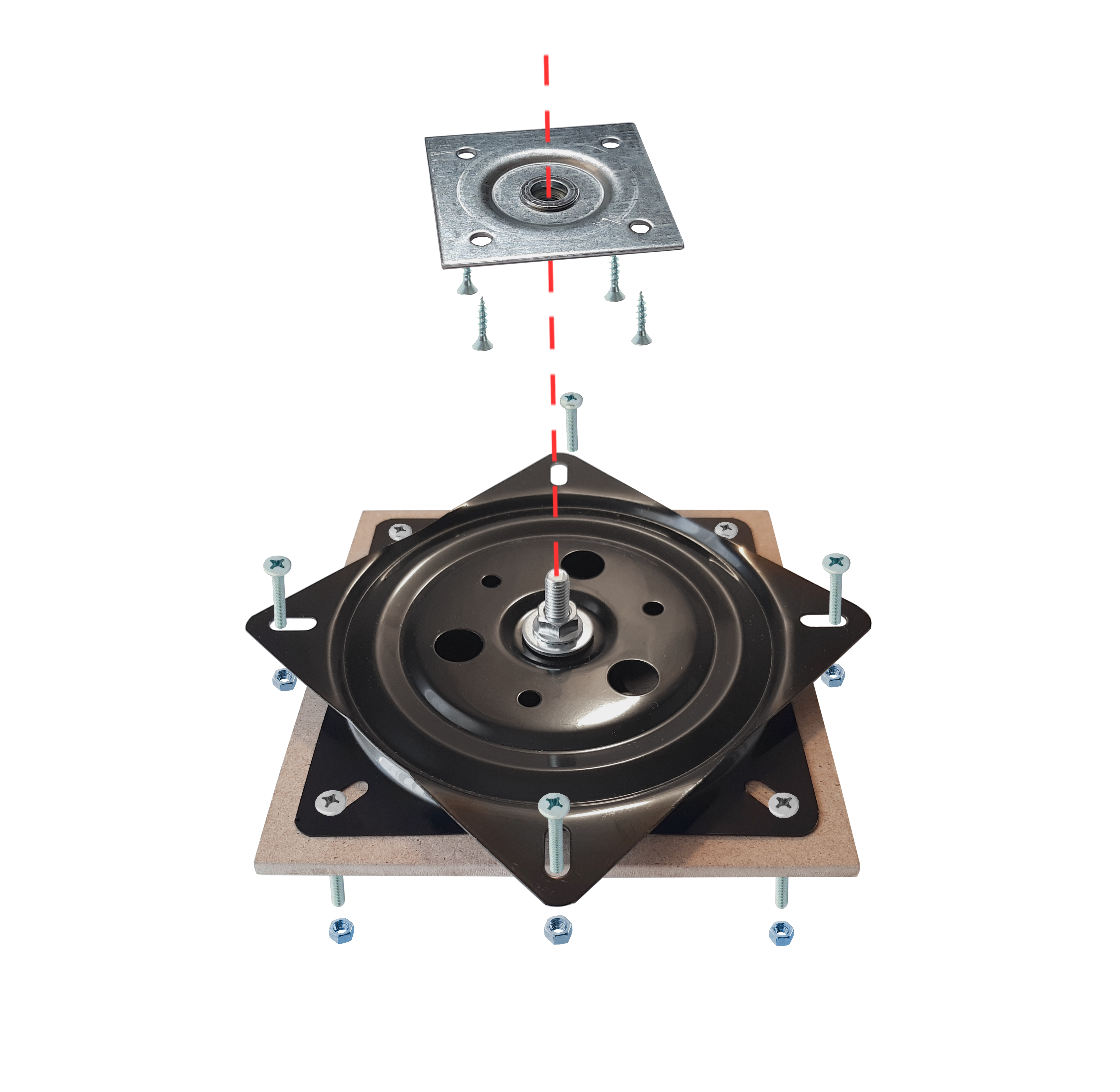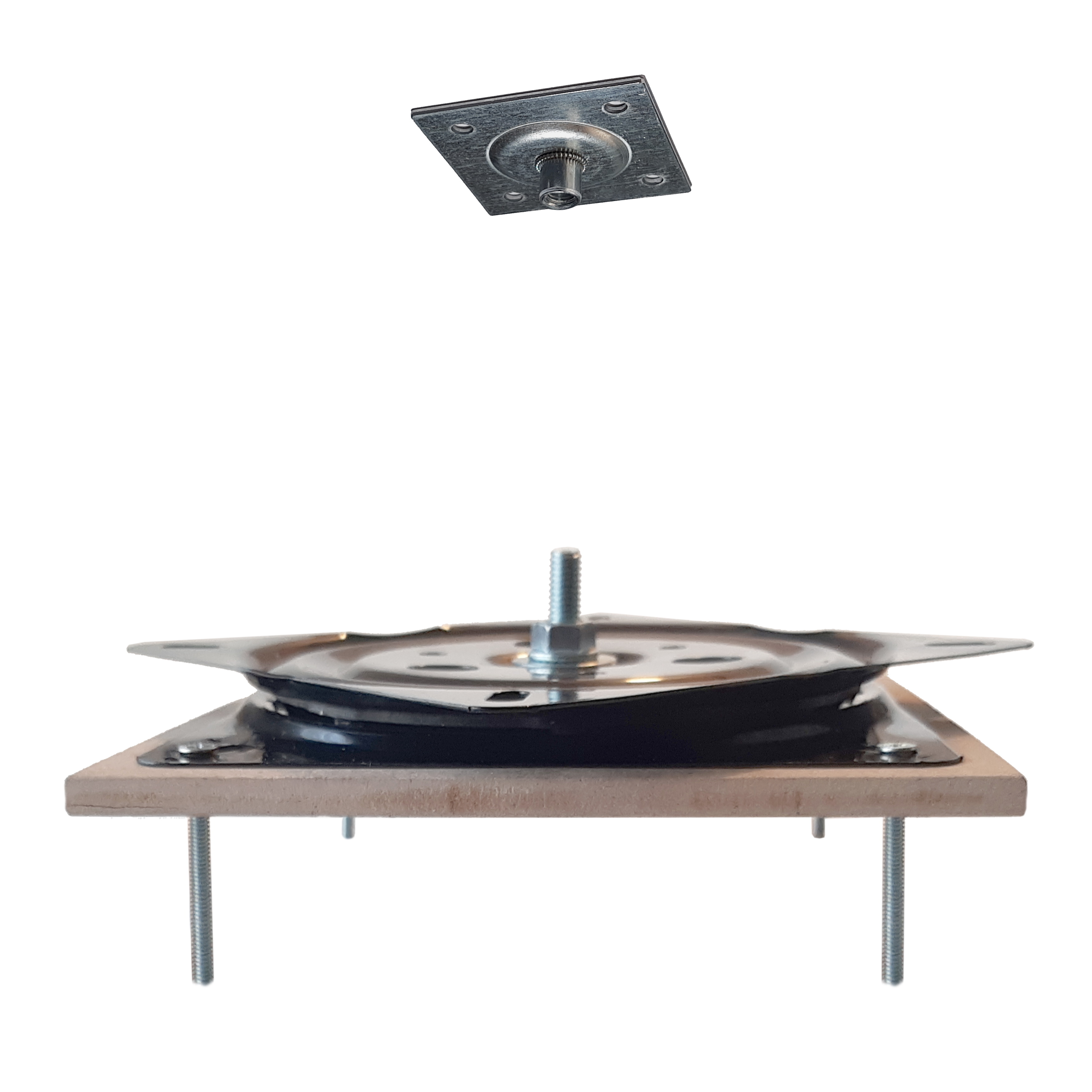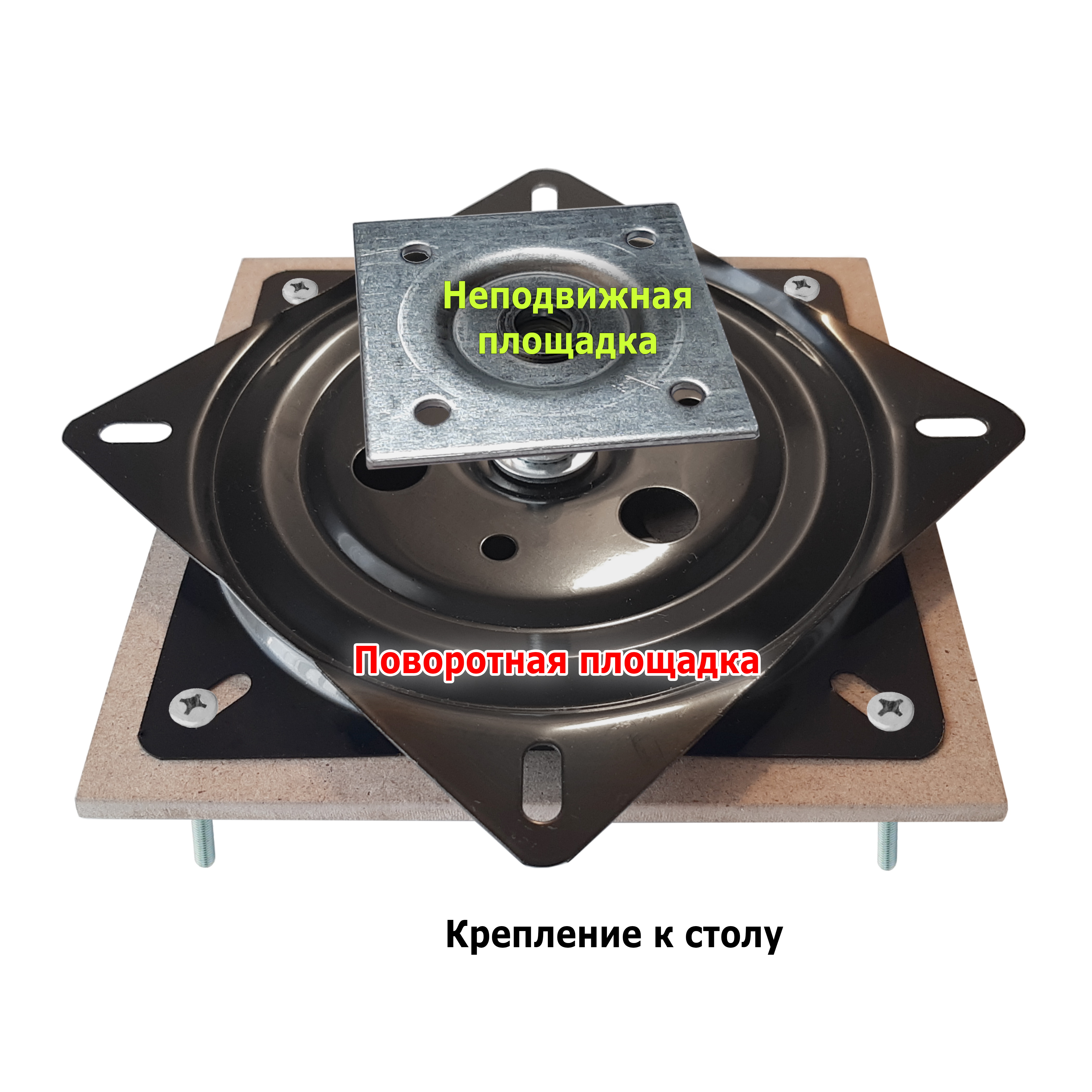 Механизм устанавливается между неподвижной опорной плоскостью (столом) и плоскостью вращения (поворотным кругом). Механизм крепим винтами и гайками сквозь просверленные отверстия. Квадратная площадка с гайкой крепится к будущему неподвижному кругу саморезами.