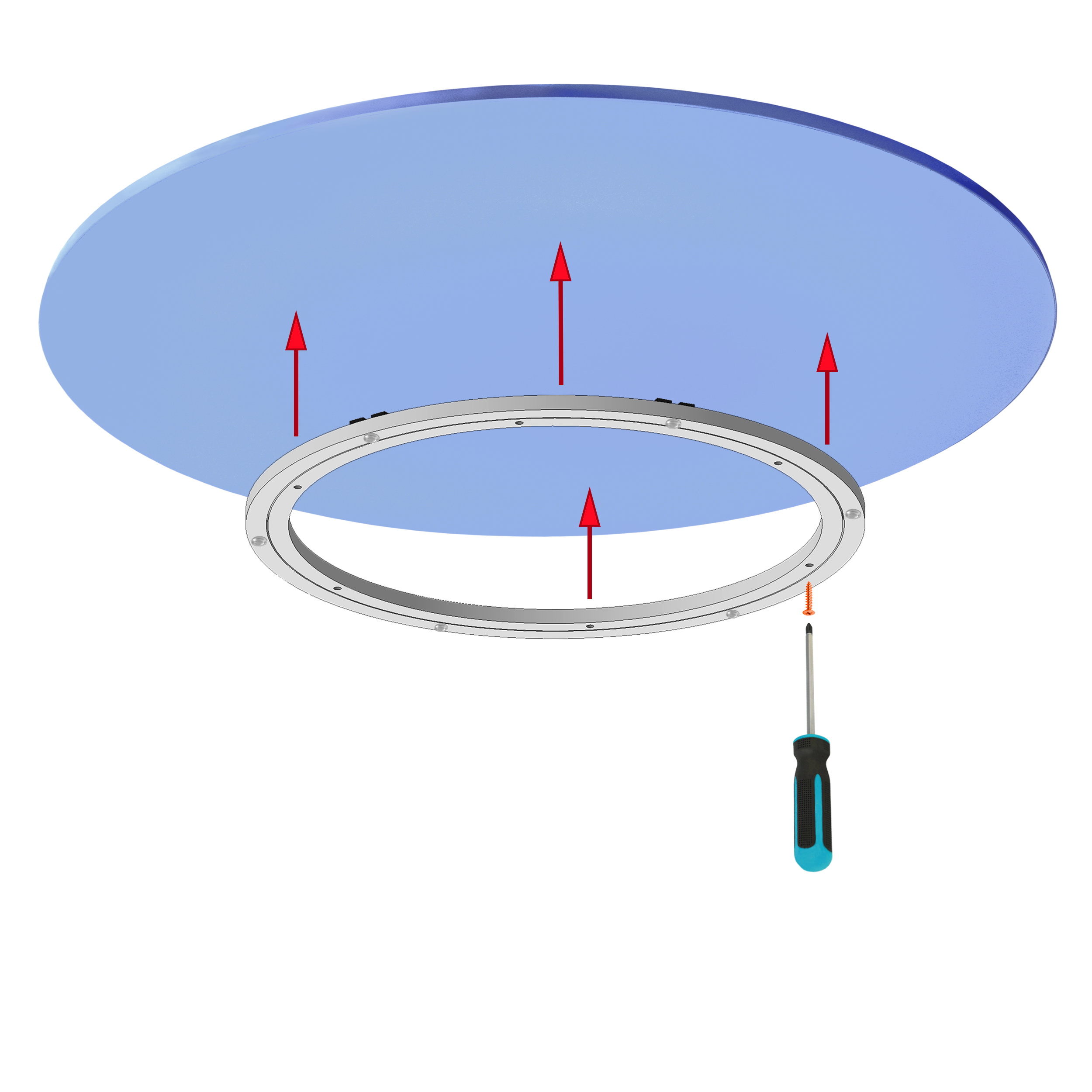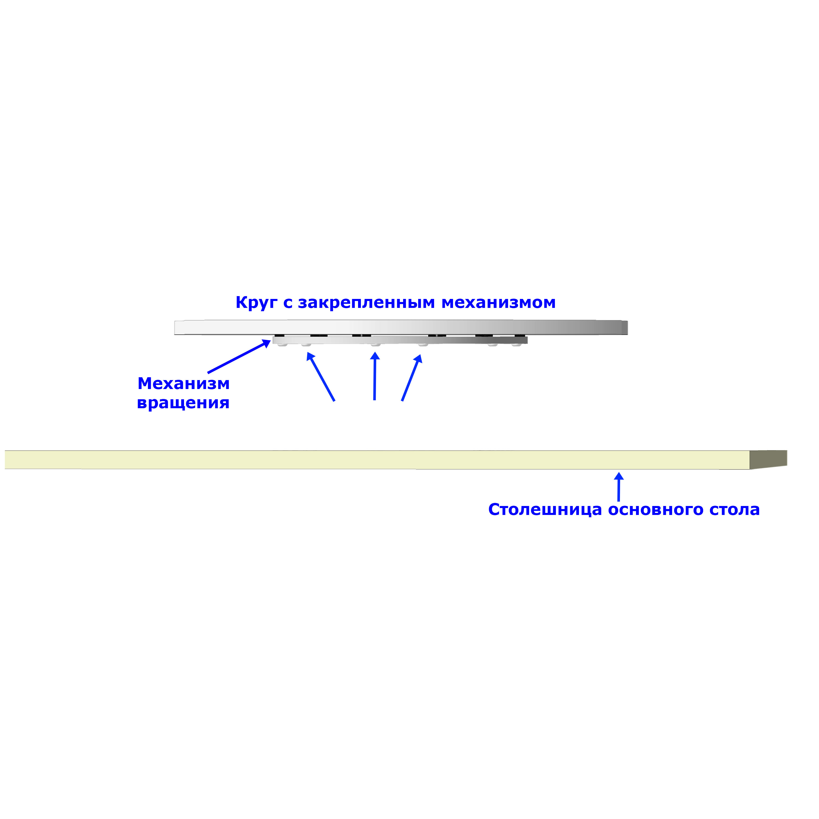 Для сборки крутящегося центра стола дополните механизм круглой столешницей подходящего диаметра. Вы можете приобрести готовые круглые столешницы из дерева, МДФ, ЛДСП и т.д.