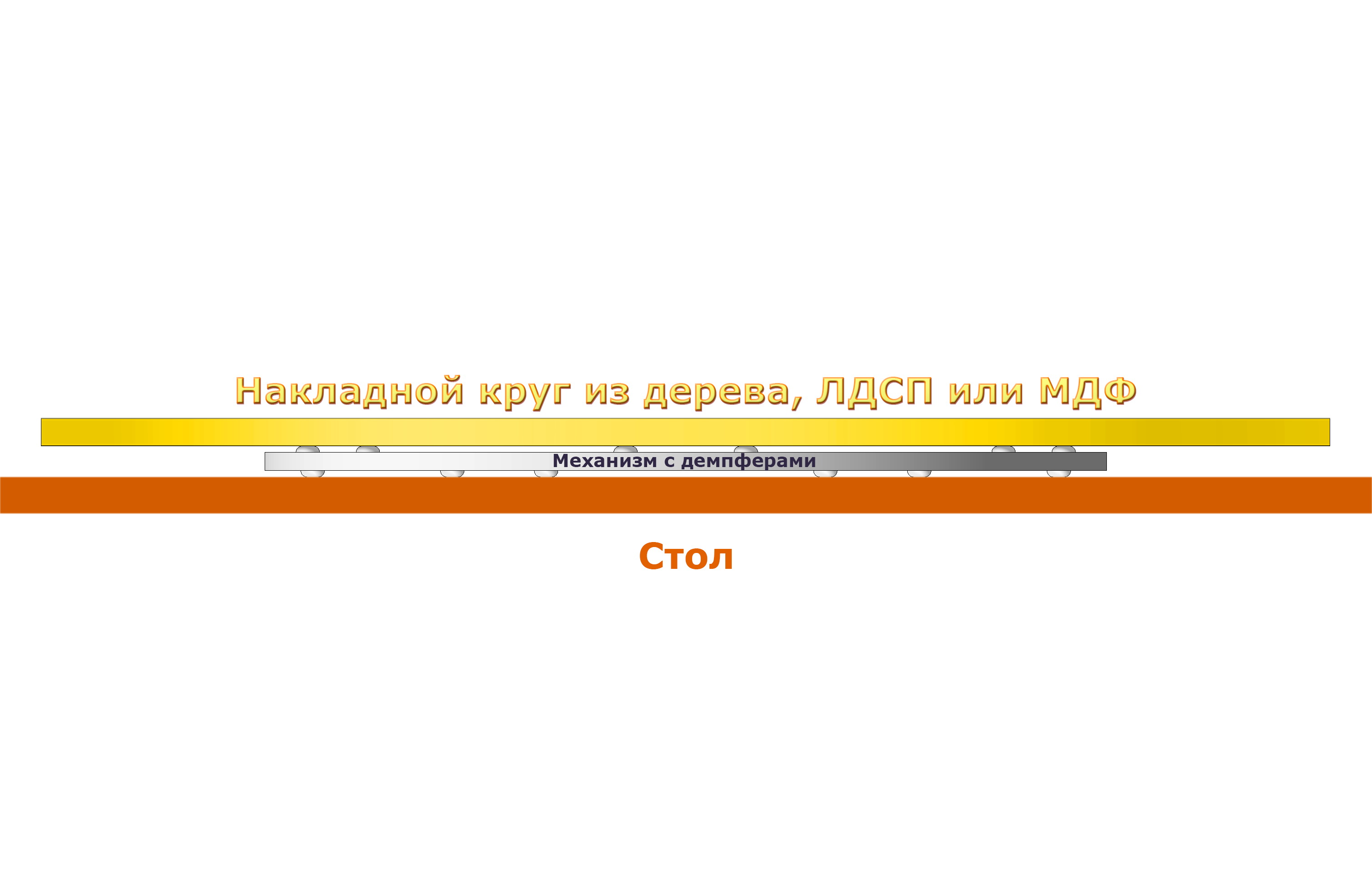 Быстрая сборка: механизм ставится в центр стола, поворотный круг кладётся на механизм. Не нужно ничего сверлить и привинчивать! Силиконовые демпферы препятствуют сдвигу круга при вращении рукой.