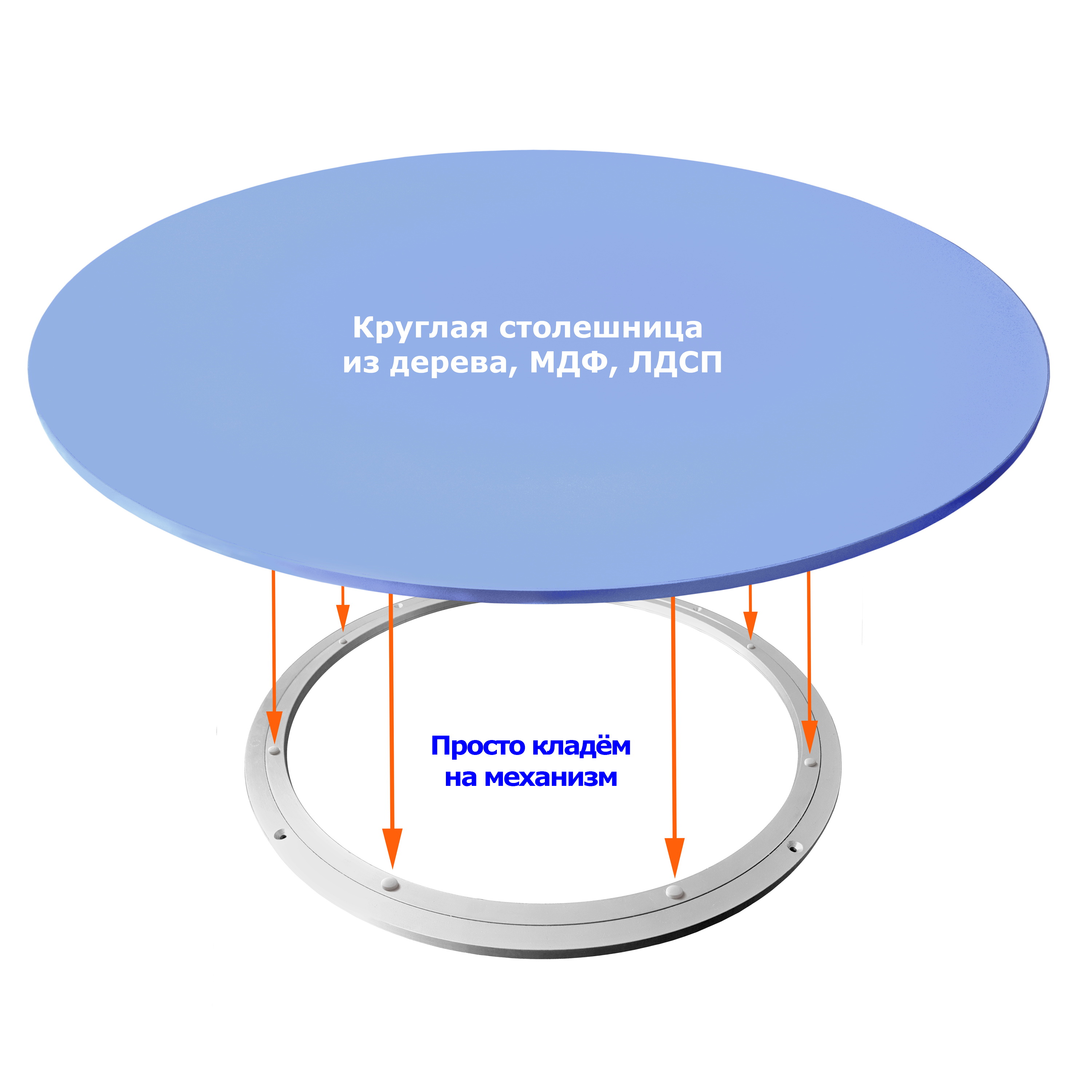 Для сборки крутящегося центра стола дополните механизм круглой столешницей подходящего диаметра. Вы можете приобрести готовые круглые столешницы из стекла, дерева, МДФ, ЛДСП и т.д.