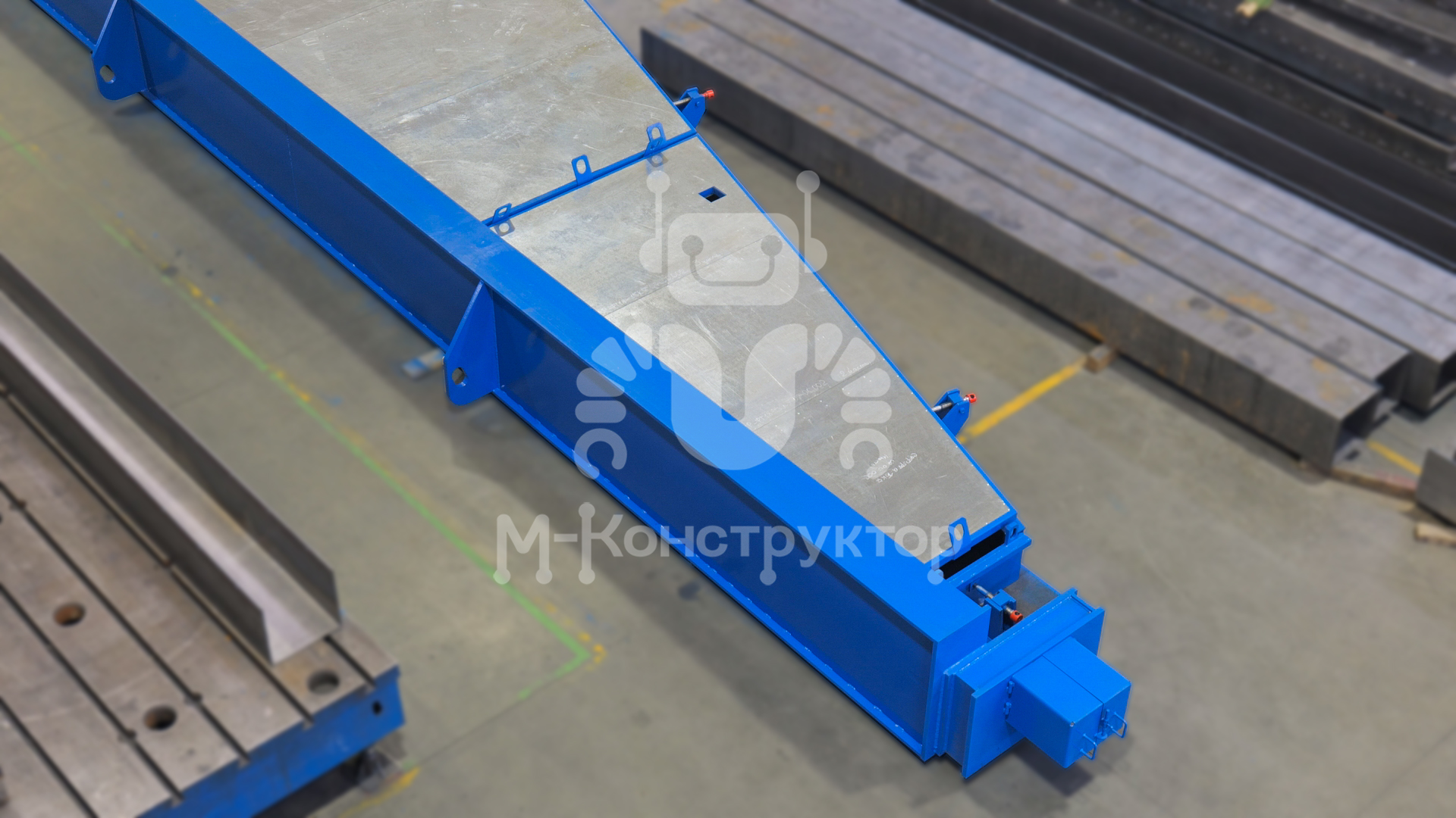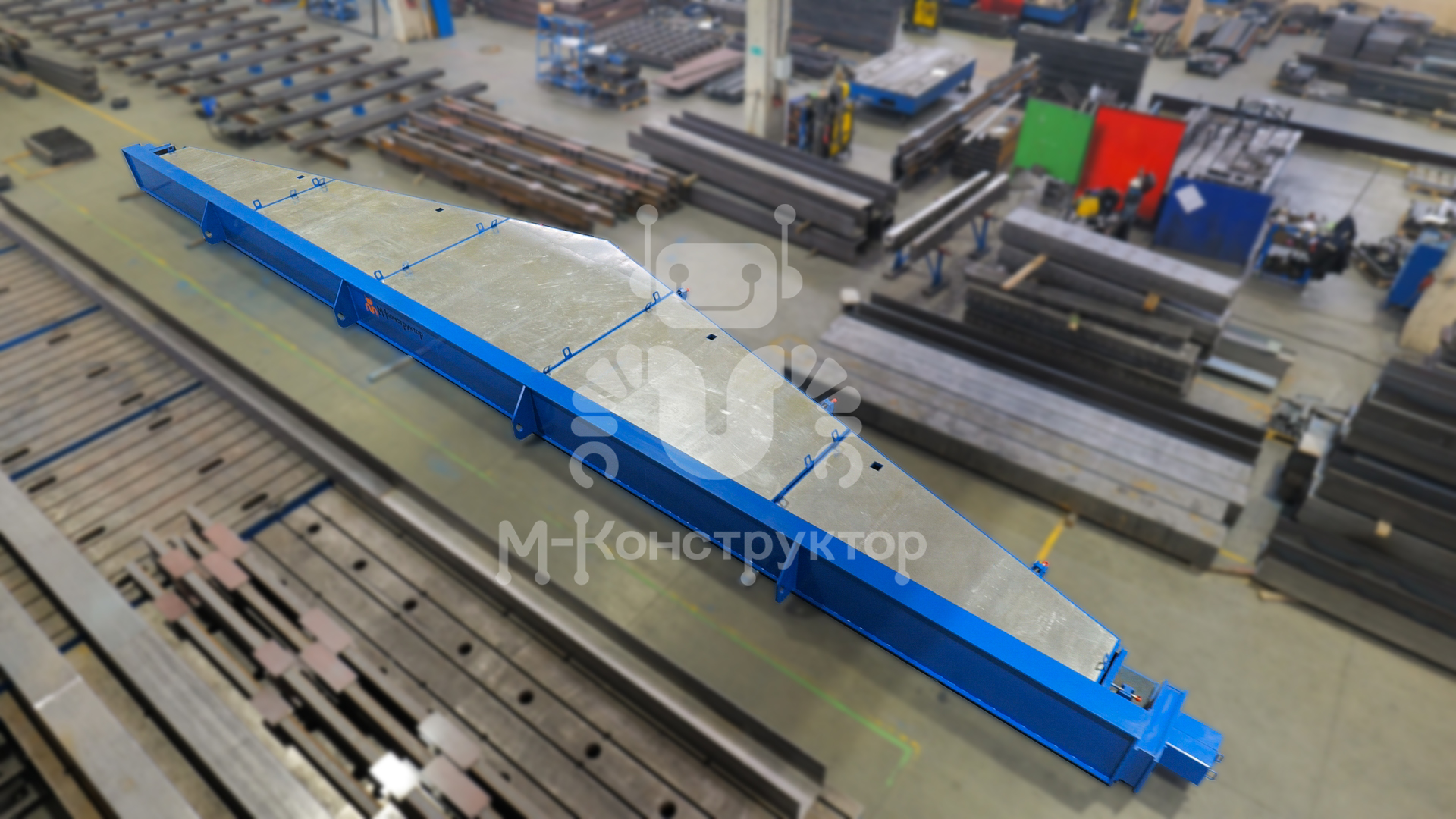 Металлоформа представляет собой неразборную конструкцию треугольного сечения длиной 20 134 мм, шириной 3 825 мм и высотой 790 мм. Габариты изготавливаемого изделия — 17 980 × 3 010 × 300 мм. С торцов силовой рамы установлены упоры для запуска и натяжения арматуры, закрытые защитными кожухами для обеспечения безопасности персонала.