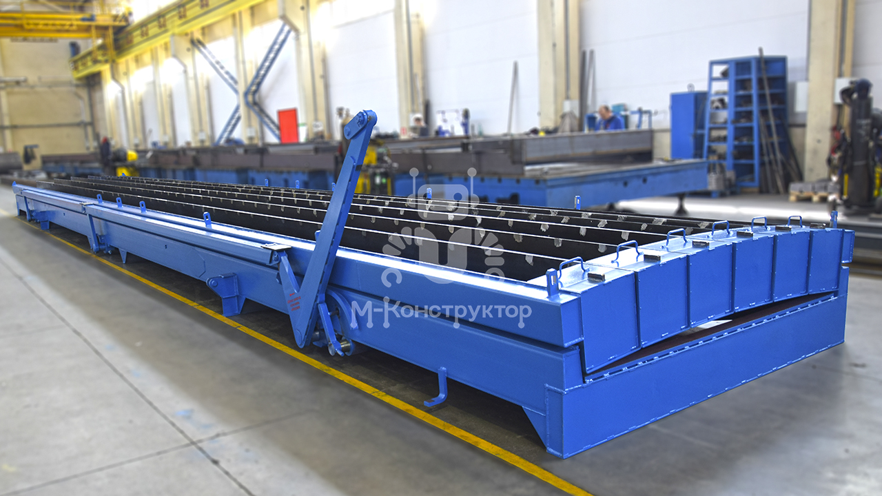 Под ручьями единый механизм который приводится в действие с помощью наружного рычага, расположенного на продольном борту формы. При поднятии рычага осуществляется синхронное движение всех ручьев вверх, что обеспечивает равномерное отделение формующих стенок от бетонного изделия. После завершения распалубки изделия извлекаются с помощью кранов или строповочного оборудования. Форма для свай типа «Ромашка» — геометрия, точность, механизм распалубки — всё подчинено главной задаче: надёжному и стабильному выпуску железобетонных изделий, отвечающих высоким темпам строительства.
