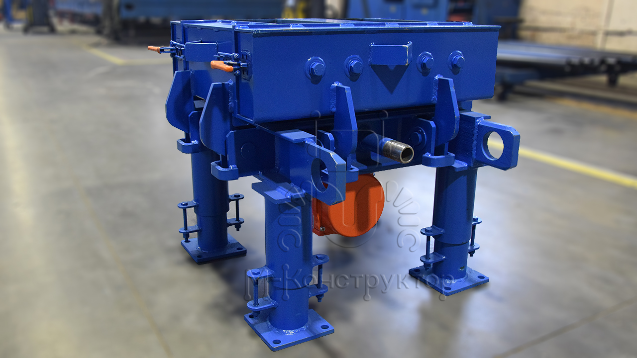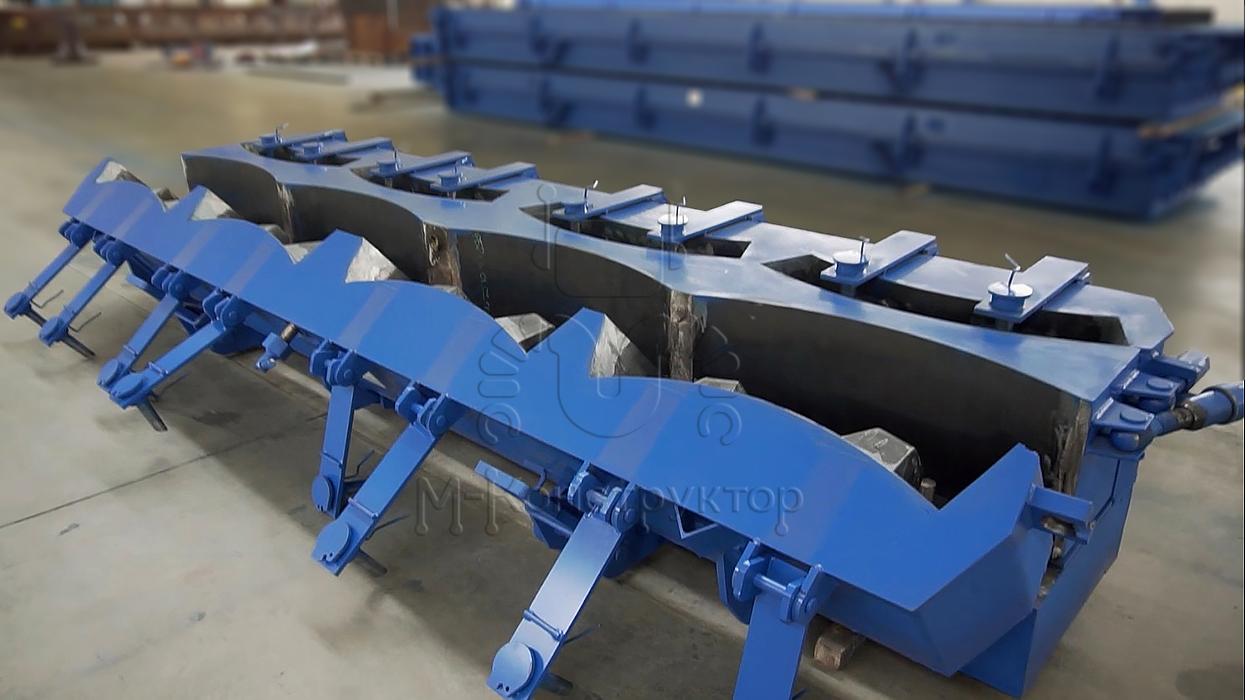 Металлоформа оснащена пустотообразователями для создания пустот в бетонном изделии, за счет которых и происходит их соединение в единую конструкцию. Откидные борта формы упрощают распалубку готовых бетонных изделий.