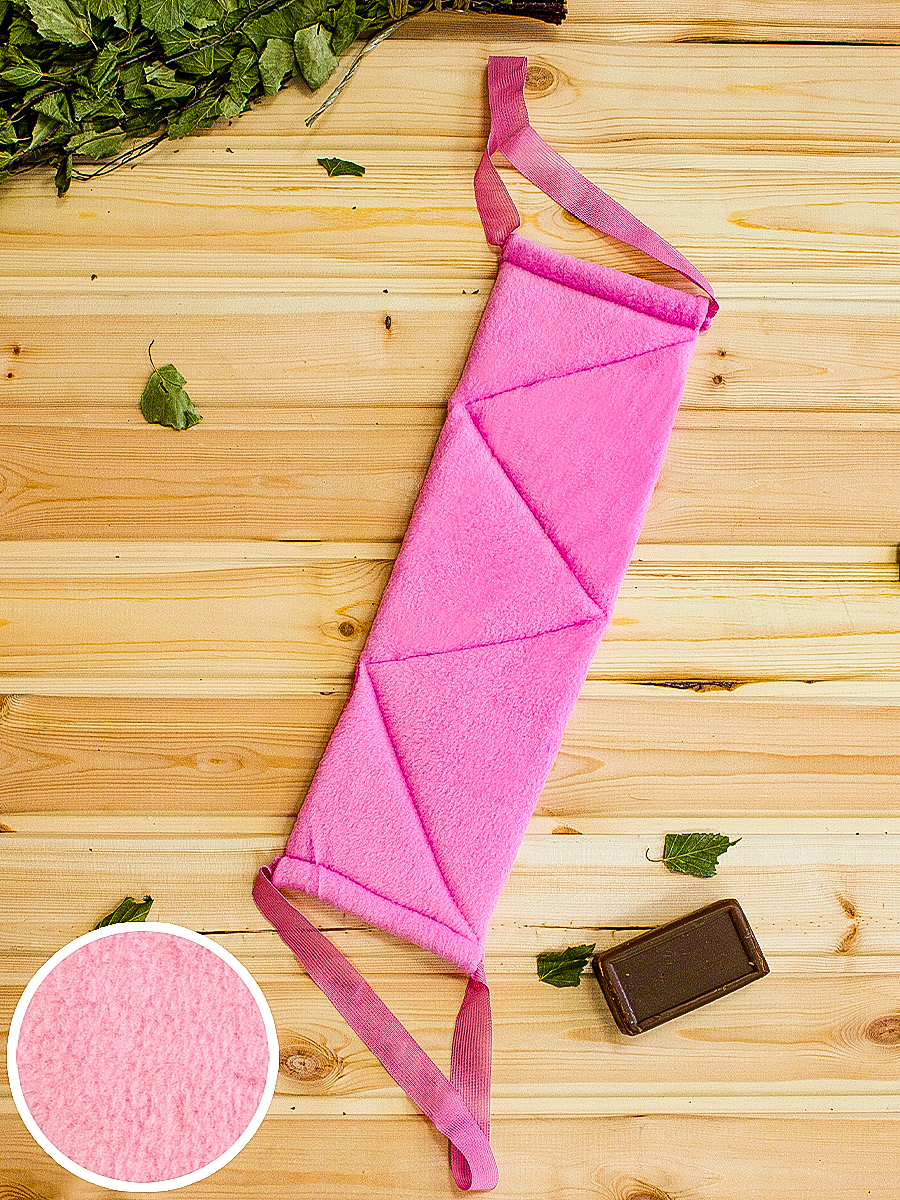 Мочалка двухсторонняя. С одной стороны мягкая и нежная, а с другой более жесткая. В нежном розовом цвете.