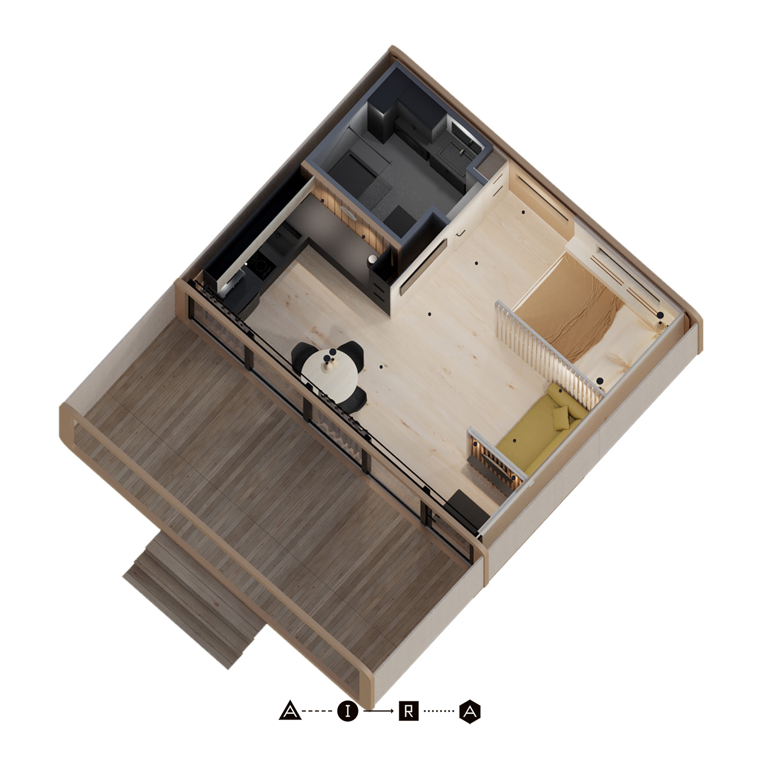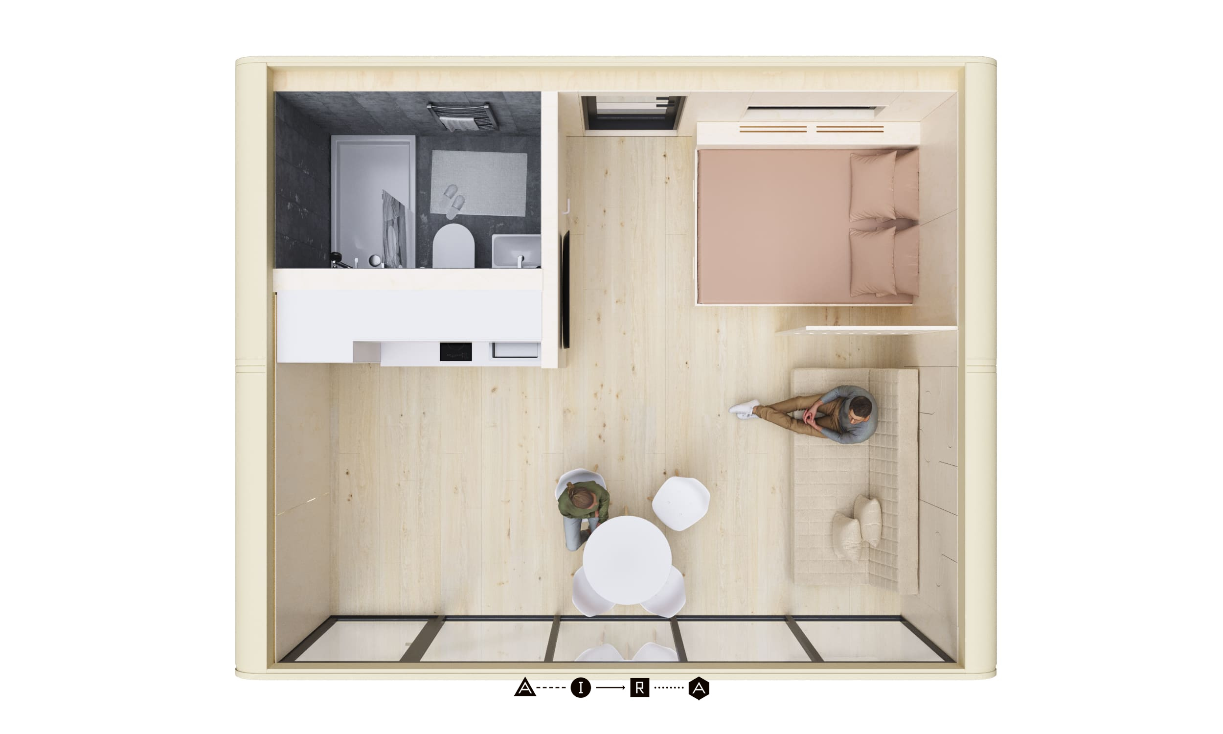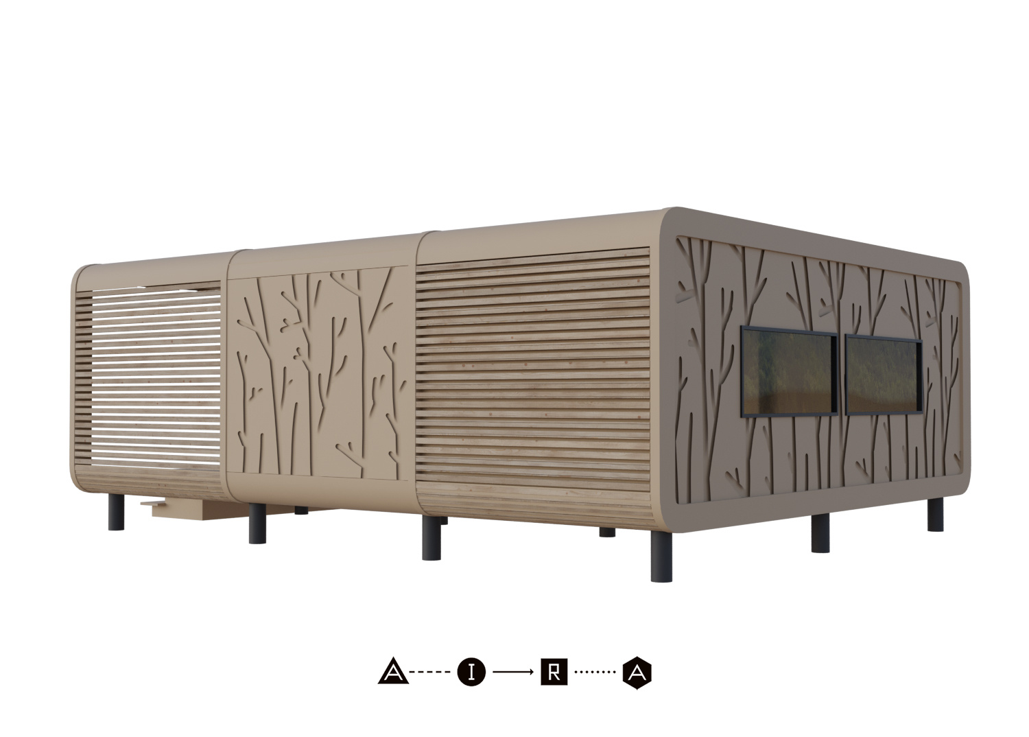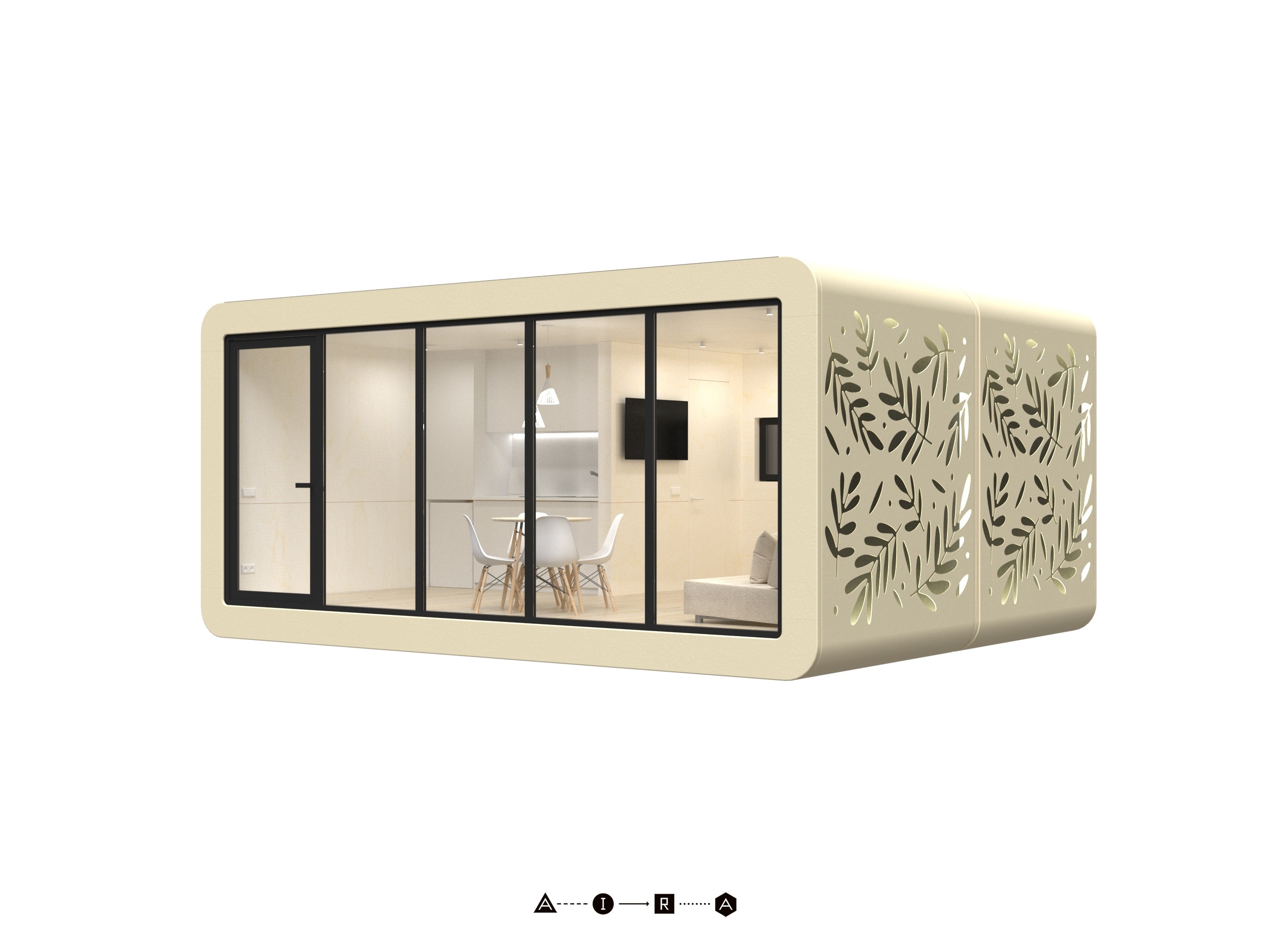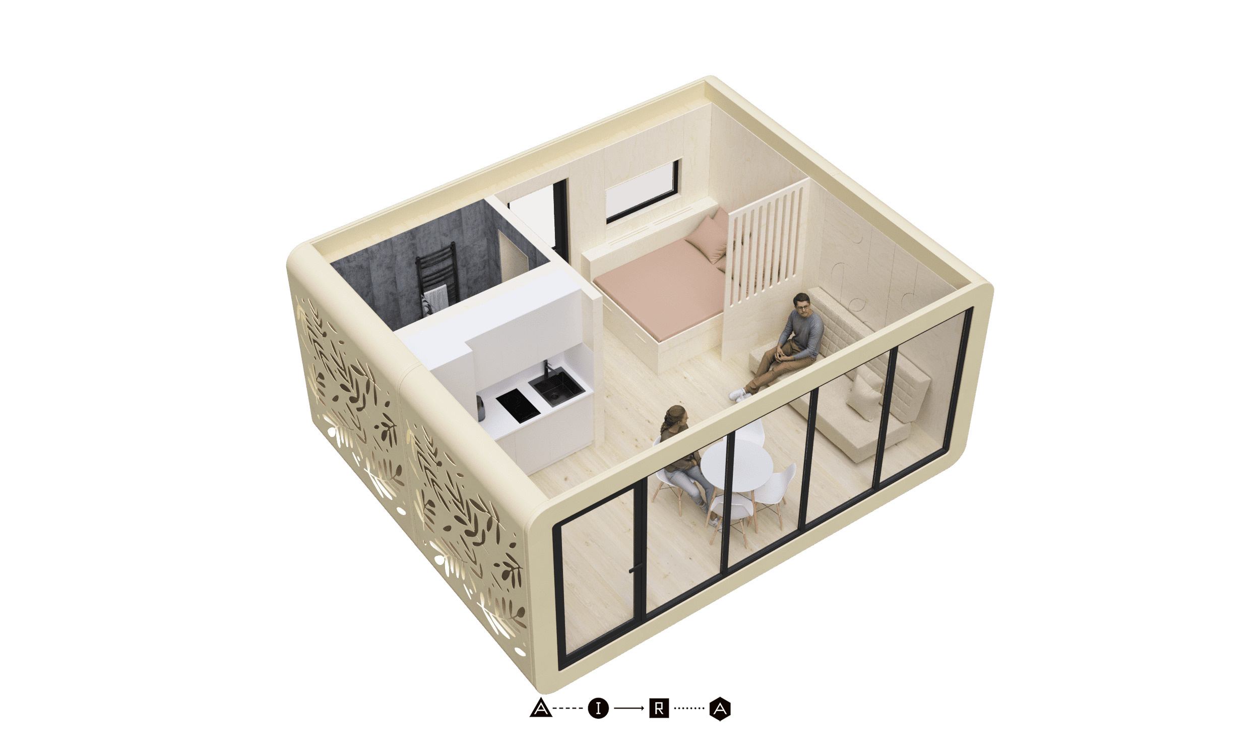 Модульный дом для комфортного круглогодичного проживания семьи из 3-4 человек. Общая площадь дома с террасой — 40,7 м². Состоит из двух жилых модулей. Изготовлен полностью из экологичных материалов, фасад выполняется из сверхпрочного монолитного стеклопластика, который годами не теряет своих исходных свойств.