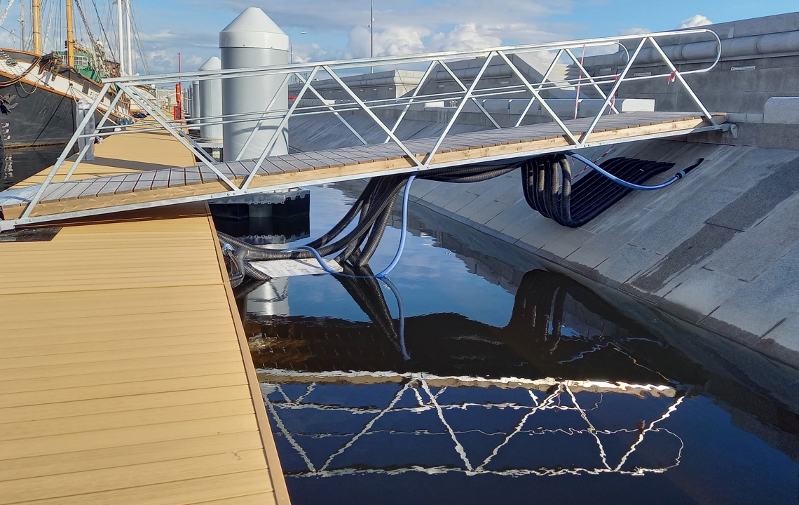 Практичный трап с перилами для организации перехода между стационарной и плавучей частью причала. В основе надежная металлическая конструкция, покрытие – комфортный деревянный настил.