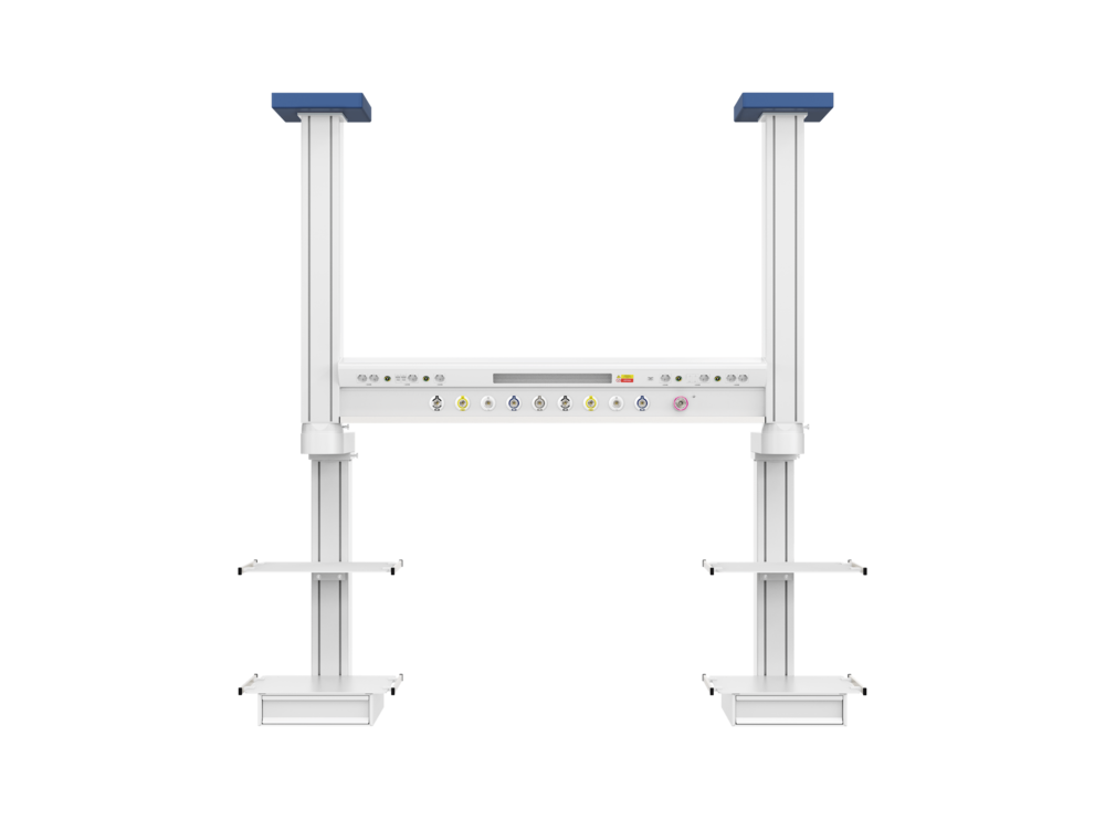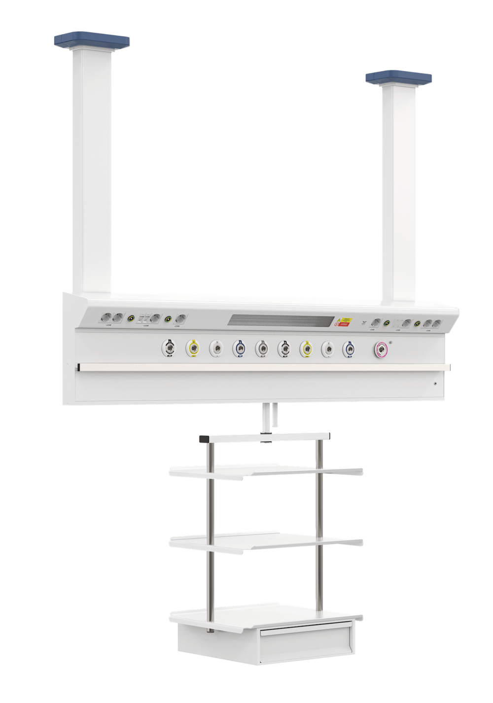 Мостовая потолочная медицинская консоль Кадуцей (Caduceus) CBN2 представляет собой горизонтальный Г-образный шкаф источников медицинских газов, электропитания и освещения, жестко закрепленный к потолку минимум на двух вертикальных опорах.