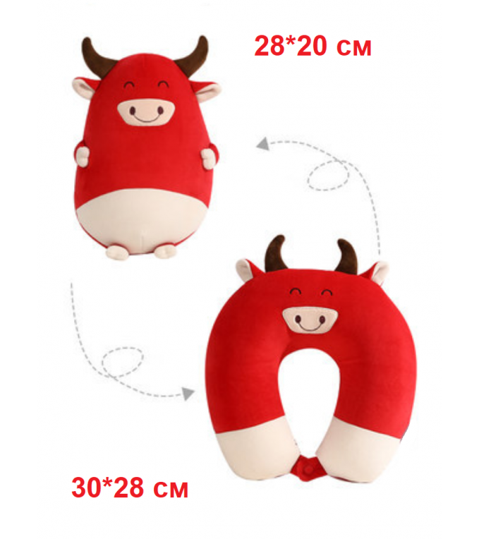 Комфортная милая подушка для ребенка бычок Трансформер. Этот необычный подарок не так прост, как кажется на первый взгляд. Подушка-игрушка является настоящим трансформером, превращается в подушку для перелета. Такой полноценный комфортный спальный комплект принесет радость любому ребенку. С ним будет весело играть и приятно отдыхать в перерывах между играми. Возможно ребенок не захочет расставаться с любимым комплектом даже во время ночного сна.