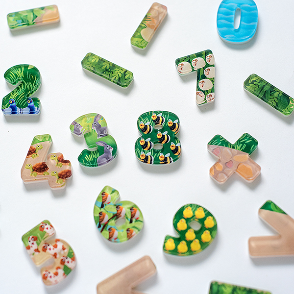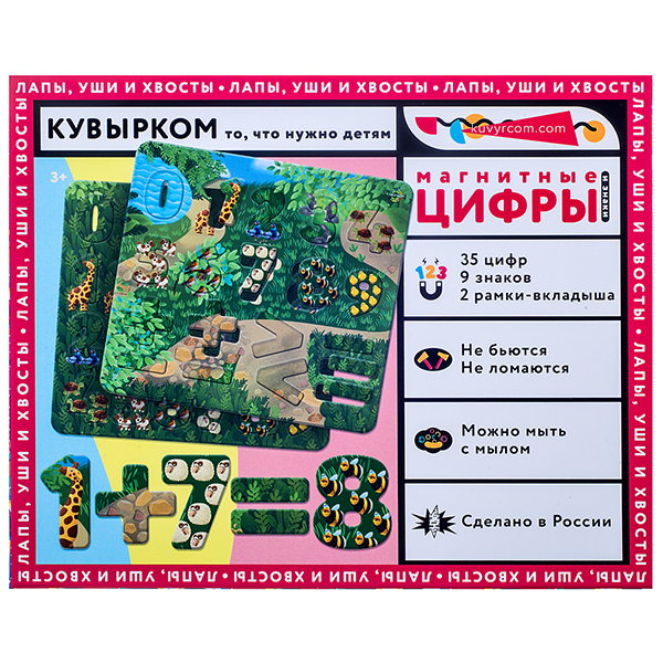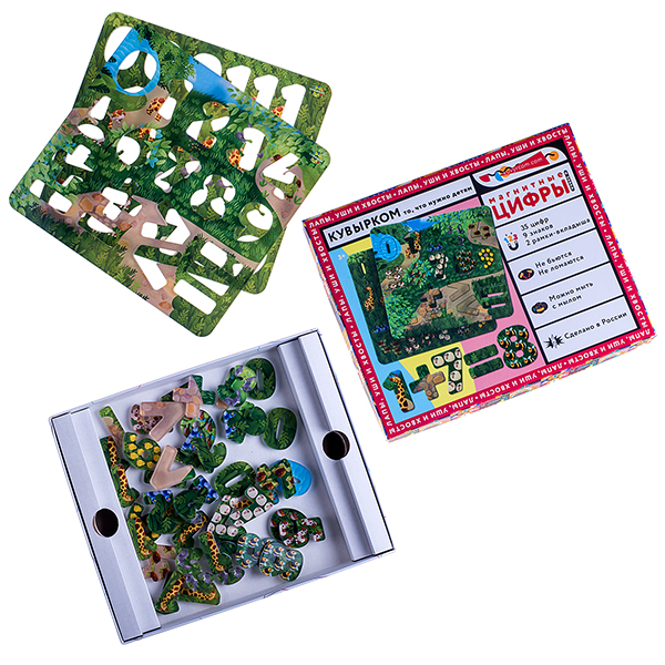 Игровой набор сделан из безопасного оргстекла по запатентованной технологии: цифры и знаки не бьются и не ломаются, их можно мыть с мылом, рисунок не выцветает, магниты надёжно спрятаны внутри. Все элементы удобно размещены в прочную подарочную коробку с нишей для хранения магнитных элементов и полочкой для размещения рамок.