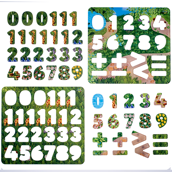 МАТЕМАТИЧЕСКИЙ НАБОР КУВЫРКОМ состоит из 35 магнитных цифр высотой 35 мм, 9 знаков и 2 рамок-вкладышей (можно использовать как трафареты или пазл).