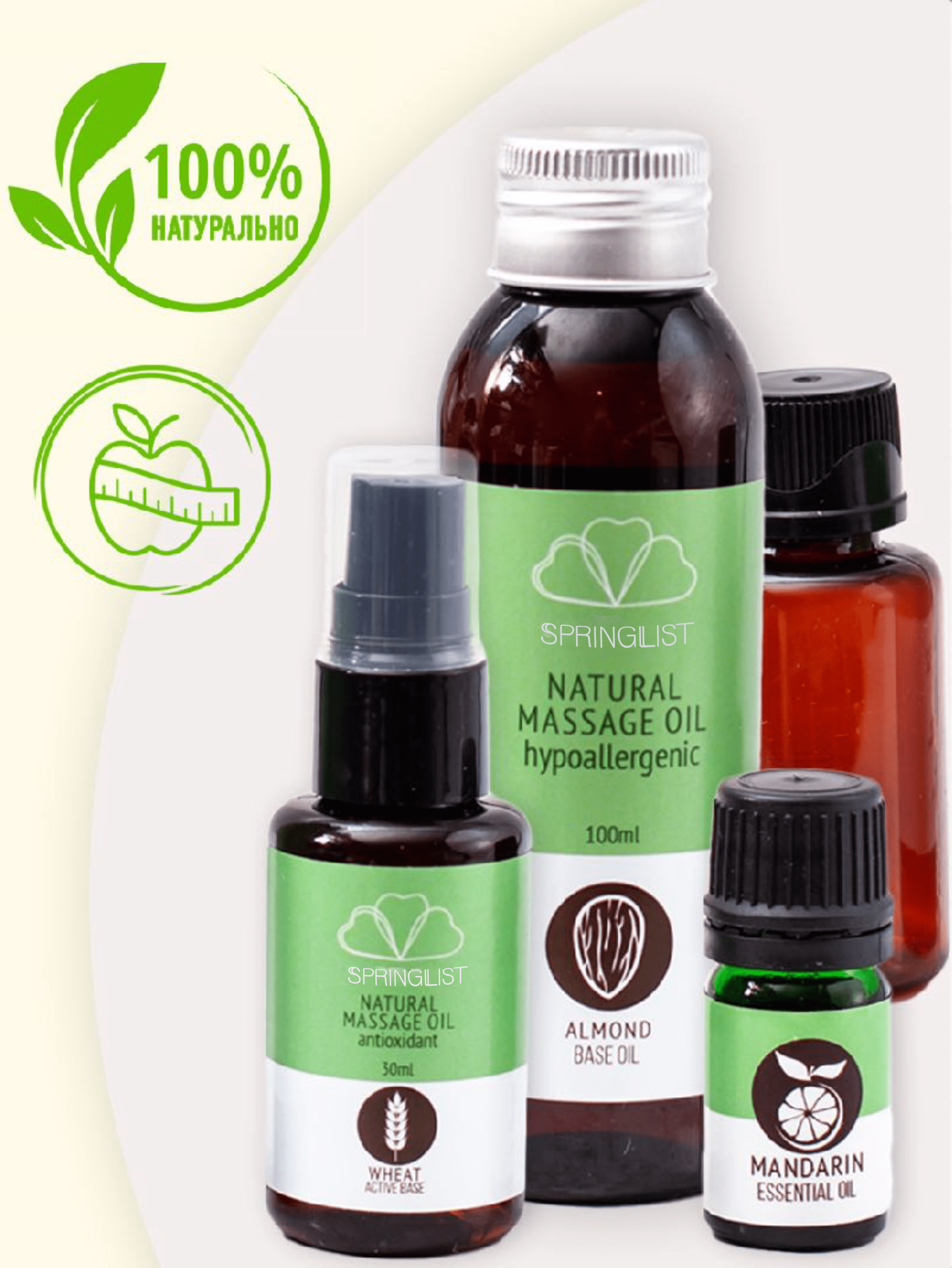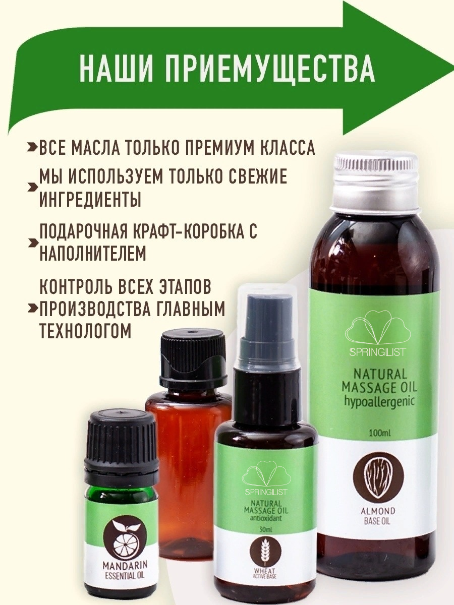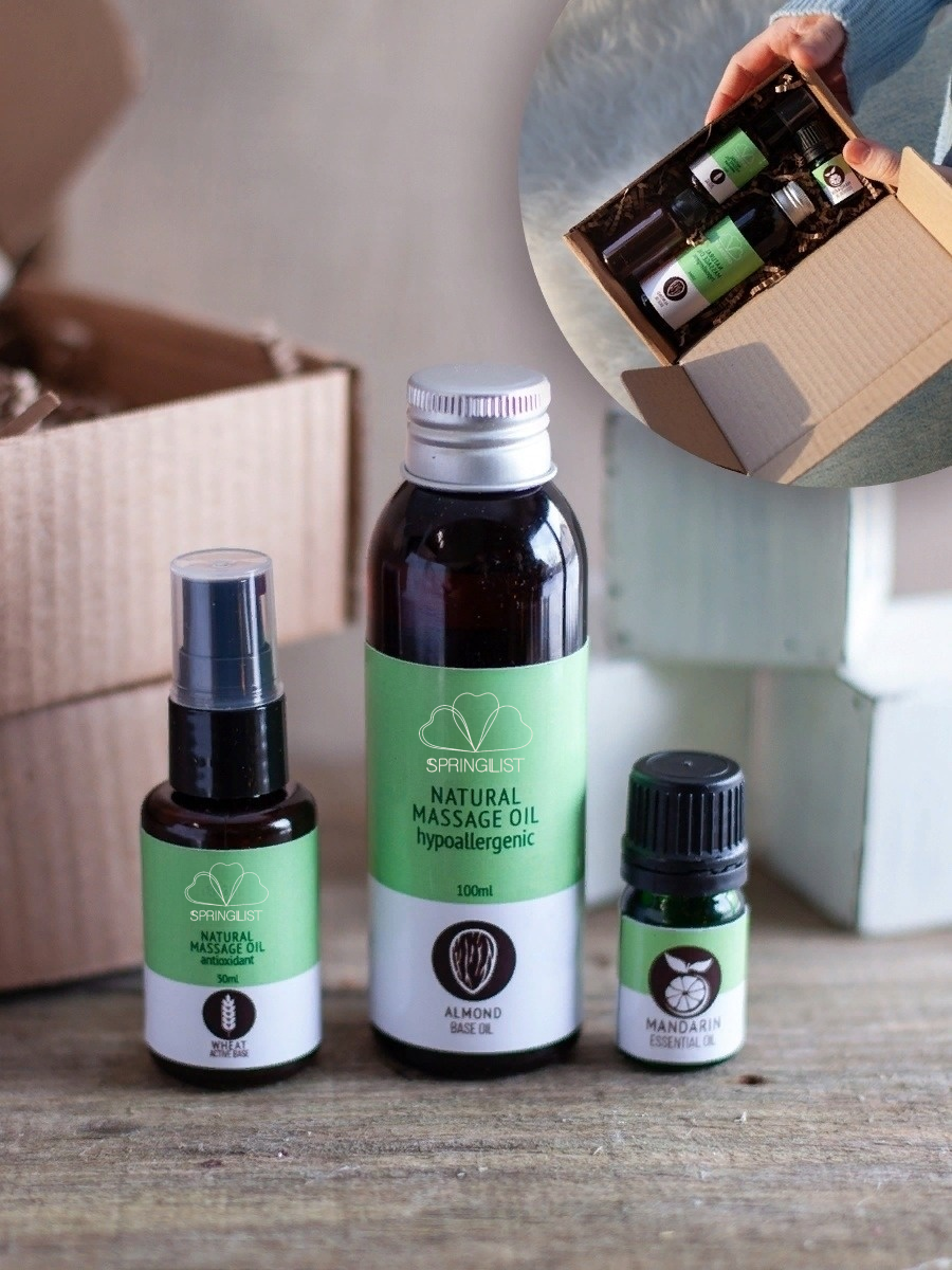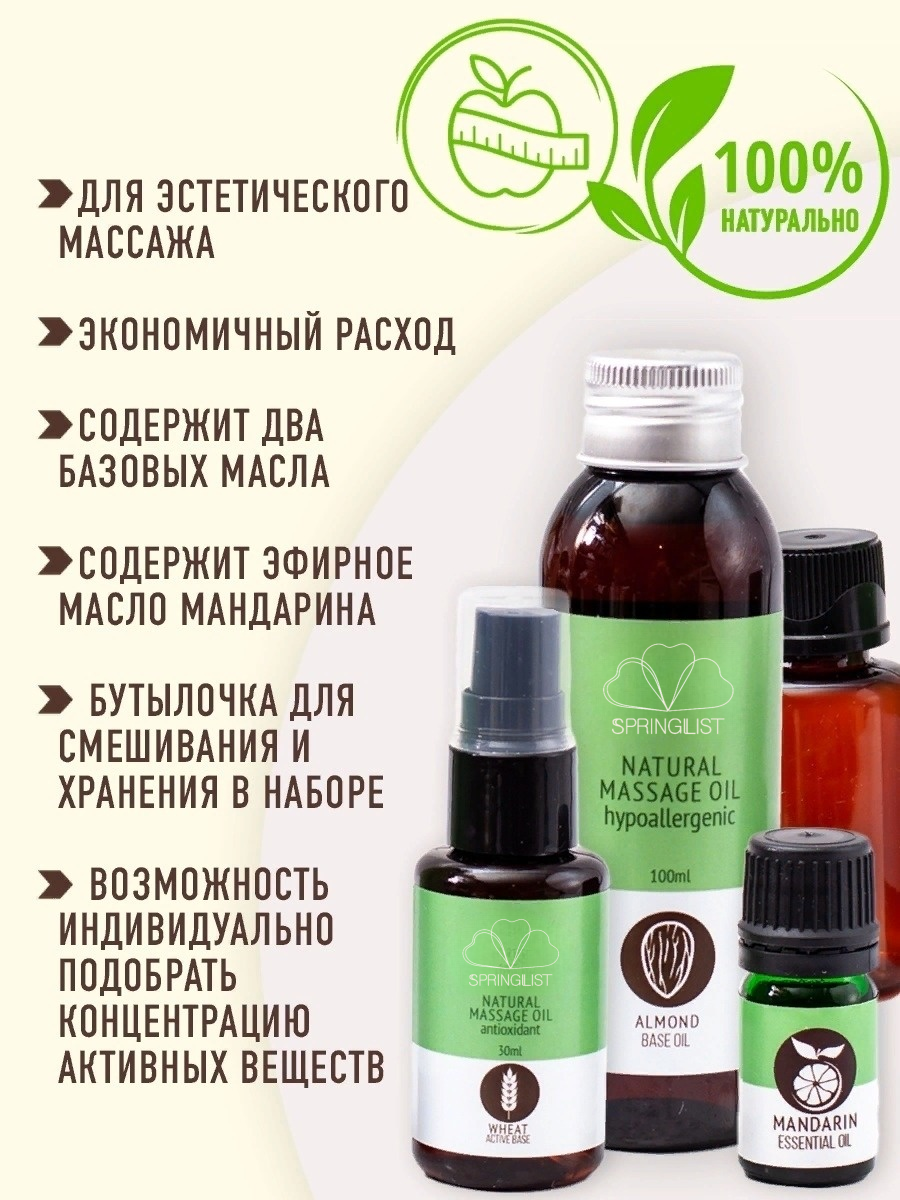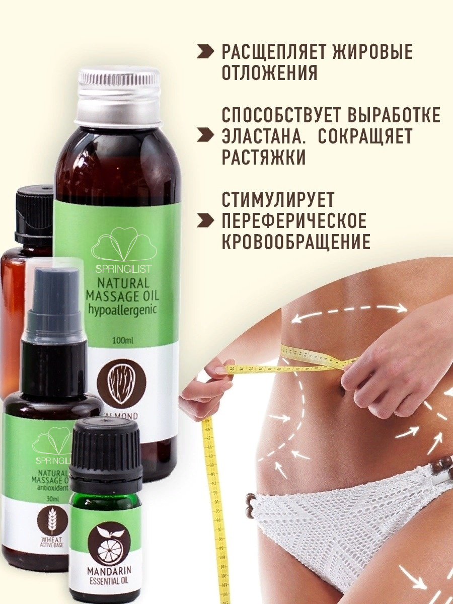 Массаж важный раздел косметики для женщин,помогающей в уходе за телом, уходе за кожей.Набор массажных масел поможет сделать тело упругим,подтянутым и увлажненным.Набор масел для массажа тела включает в себя базовое, масло миндальное, масло зародышей пшеницы, эфирное масло мандарина. В наборе есть инструкция и рецепты,по которым вы получите:масло для антицеллюлитного массажа, масло от растяжек для беременных, масло для душа, масло для бани.Миндальное масло обладает высокими транспортными свойствами, дает увлажнение, поддерживает целостность гидролипидной мантии и обеспечивает легкое скольжение. В составе масла зародышей пшеницы- ниацин,каротиноиды,фолиевая кислота. Эфирное масло мандарина стимулирует расщепление жиров, избавляет от рубцов, шрамов пост акне, тонизирует кожу,разглаживает,одно из лучших противоотечных и антицеллюлитных средств. Массажное масло относится к органической косметике и гипоаллергенно.Можно использовать для всех видов массажа,профессионального и домашнего массажа.