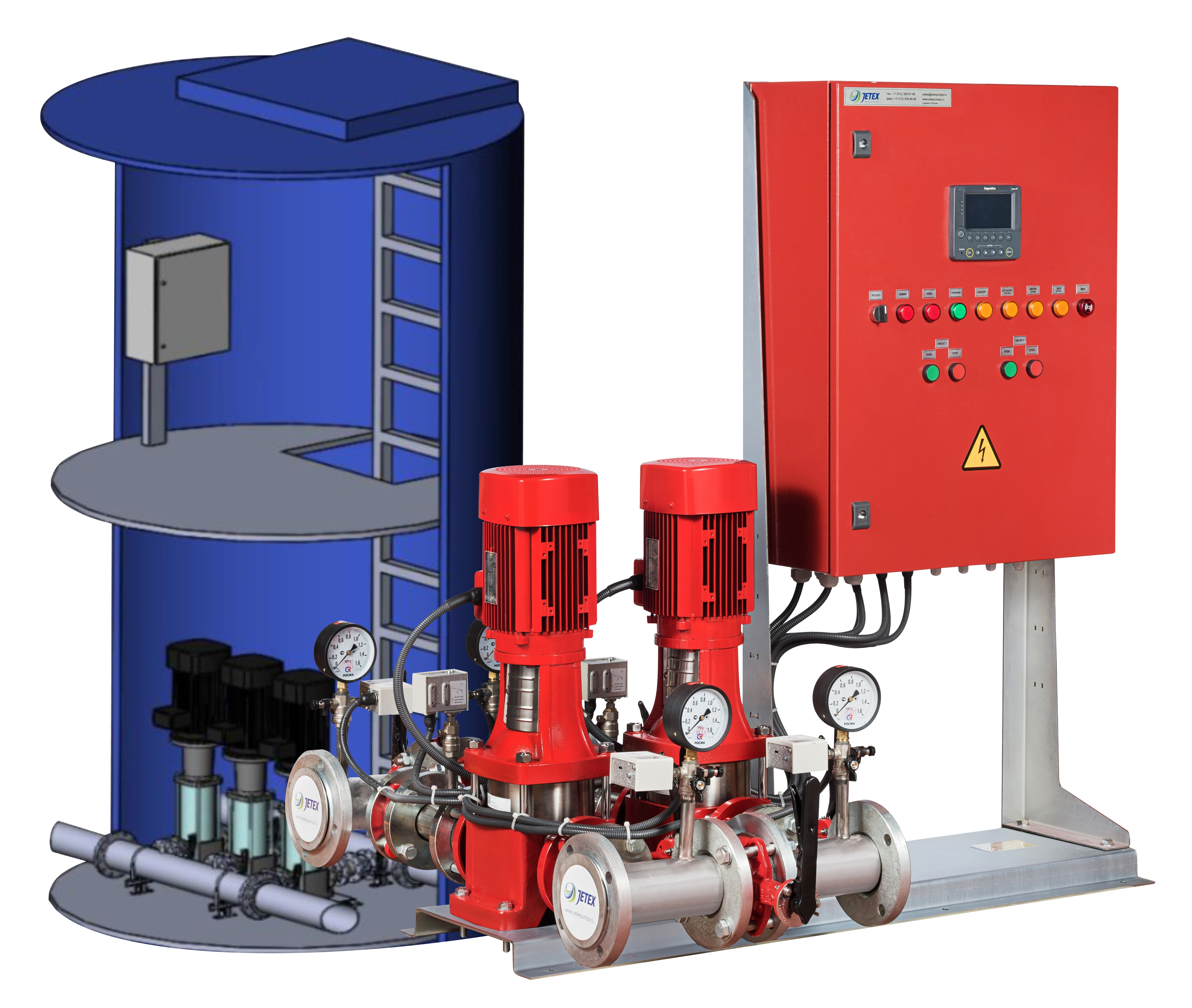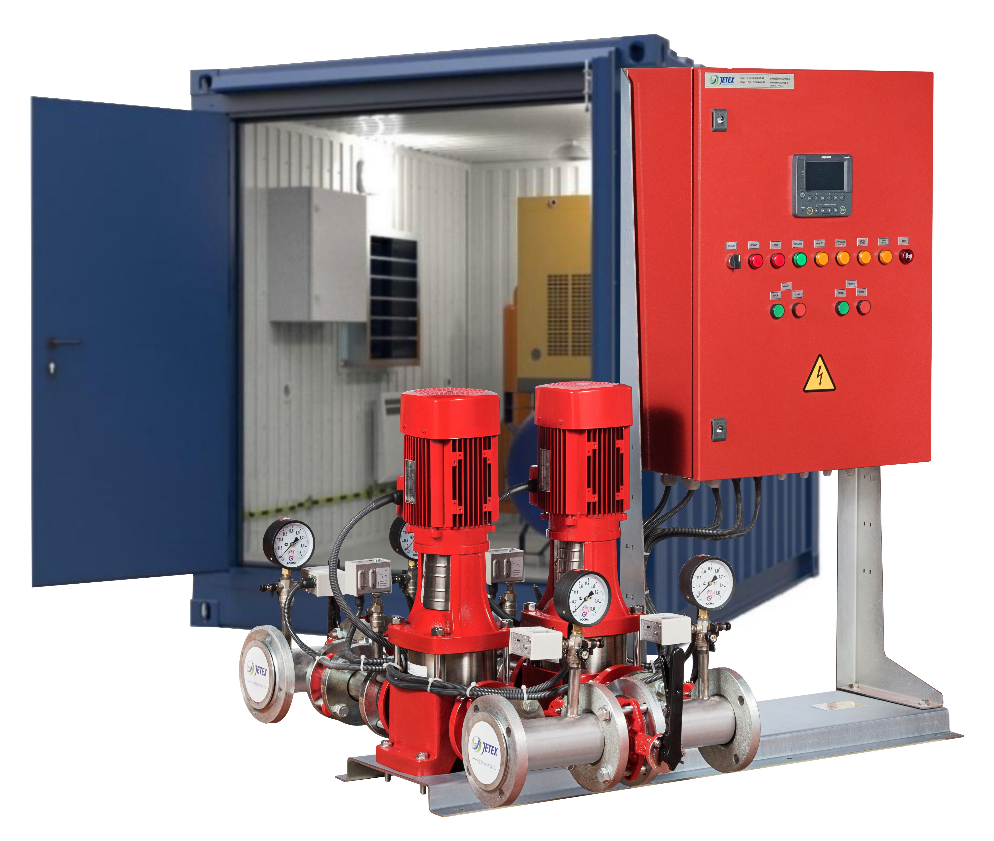 Насосные станции пожаротушения JETEX VF собственного производства. Доступные цены. Высокий КПД. Различная комплектация 1-6 насоса, со шкафом управления, с жокей-насосом. Частотное регулирование. Исполнение наземное, подземное, в блок боксе - под Ваше ТЗ. Доставка по РФ, гарантия, сервис.