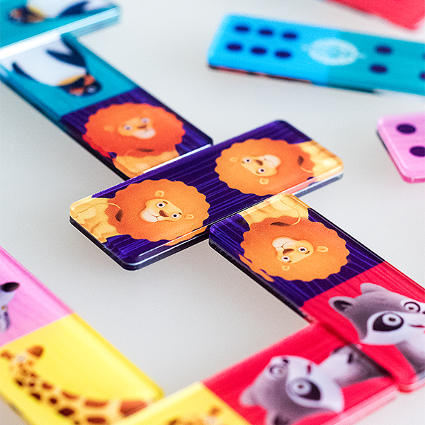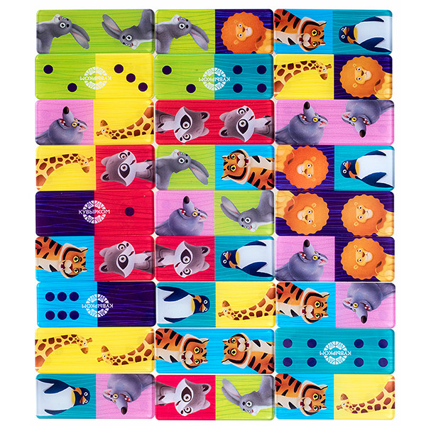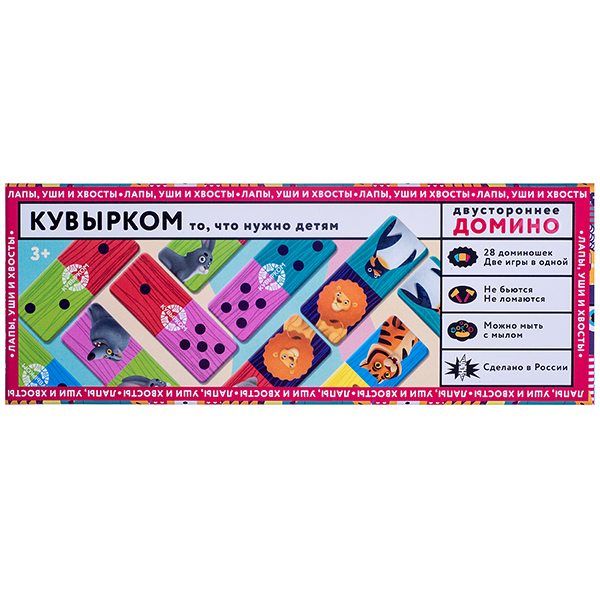 Детская настольная игра Домино для ребенка от 3 лет, комплект состоит из 28 двусторонних фишек-доминошек: с одной стороны добрые герои с лапами, ушами и хвостами, с другой – всем привычные точки.