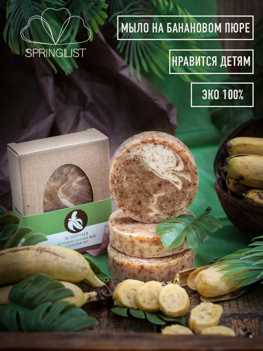Мыло на банановом пюре полностью натуральное заменит привычные жидкое мыло, мыло туалетное, мыло детское. Натуральное мыло с ярким ароматом спелых бананов, темные крапинки в дизайне честное доказательство добавления банана в состав. Мыло ручной работы обогащенное витаминам Е и маслами ши, пальмовое, кокосовое, оливковое, касторовое, прекрасно ухаживает за кожей, подходит как мыло для лица и мыло для тела, мыло банное, мыло для интимной гигиены. Мыло хорошо пенится, его можно использовать как мыло для бритья или мыло пенка. Косметическое мыло, Сварено мыло своими руками будет нежно заботиться о вашей коже и дарить только положительные эмоции. Мыло антибактериальное, прекрасно подходит для детей и аллергиков. Мыло кусковое в подарочной упаковке прекрасно подойдет как подарочный набор для женщин и мужчин на день рождение, новоселье, для банного набора, на 8 марта, маме, бабушке, подруге, любимой, папе, любимому, другу, как подарок для ребенка или коллеги.