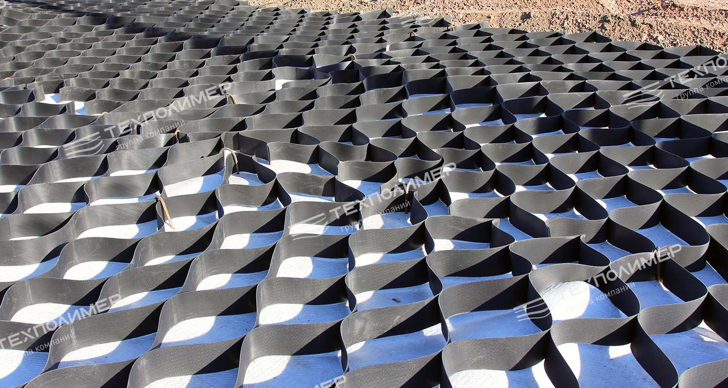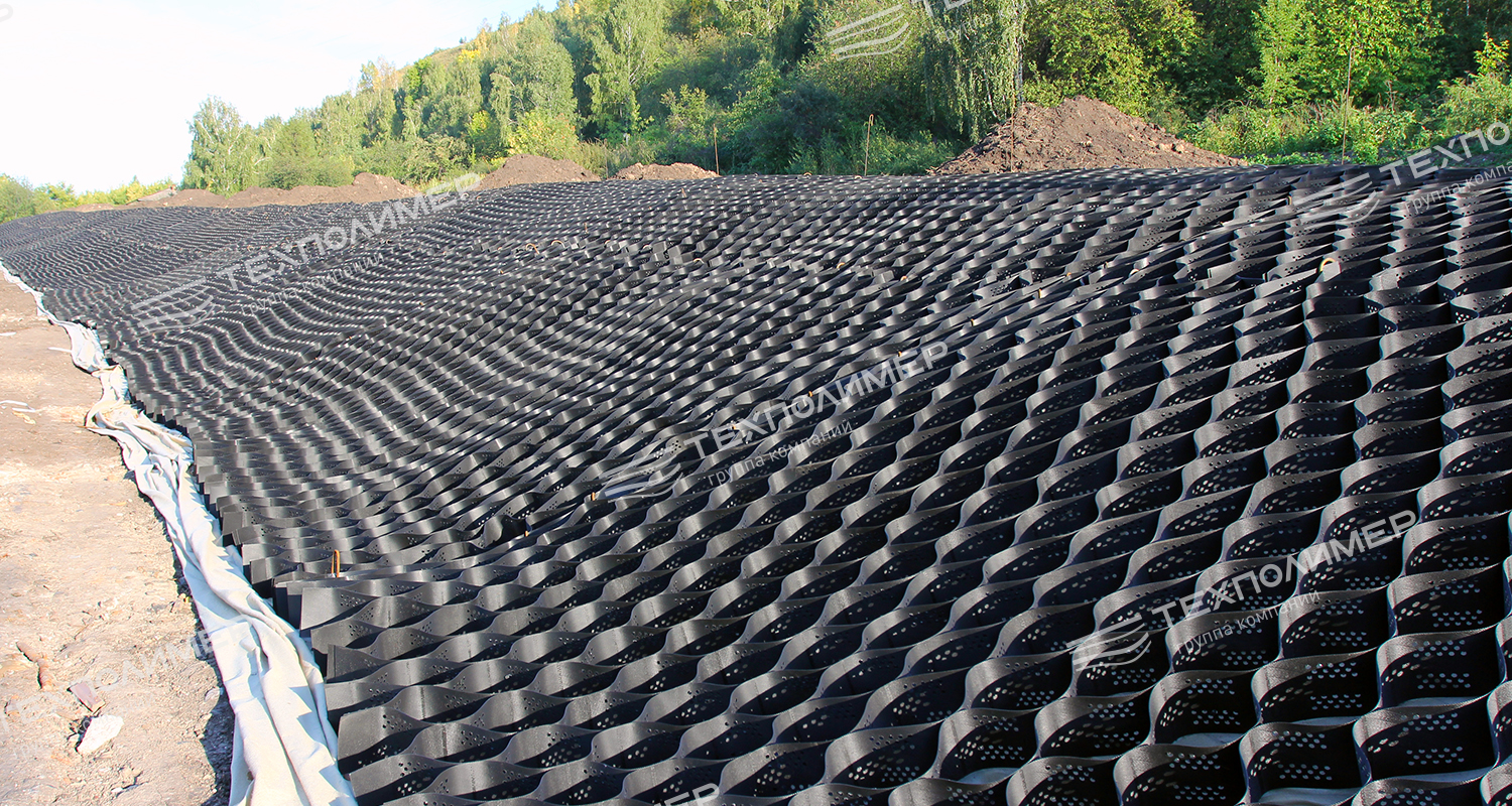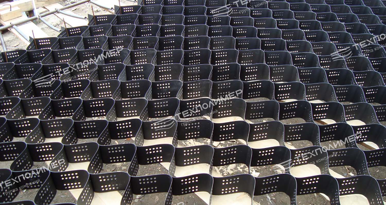 В растянутом состоянии образует объемную ячеистую структуру, которая предназначена для фиксации заполнителя (грунт, песок, щебень и т.д.).