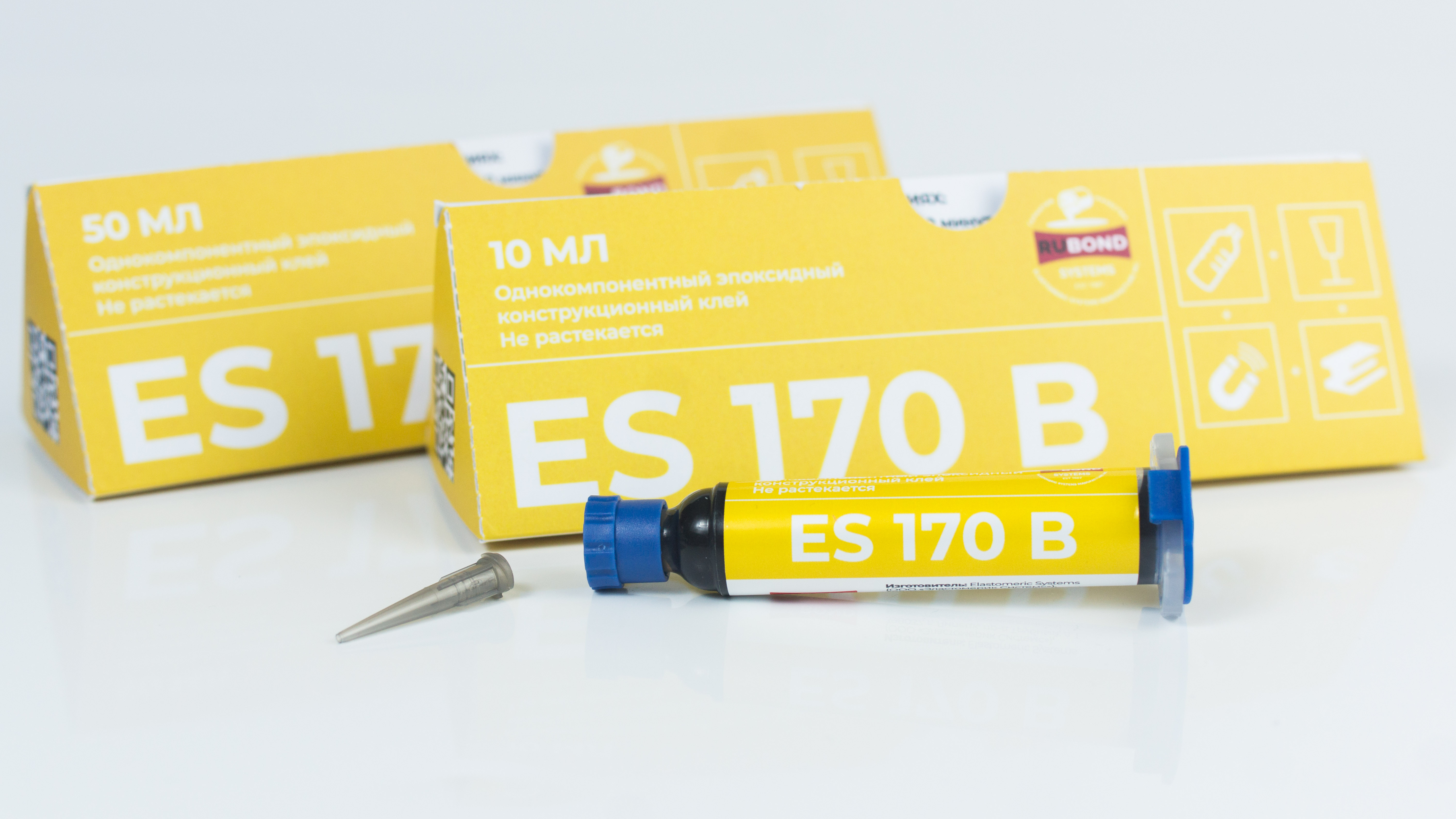 RuBond ES170 B - однокомпонентный эпоксидный конструкционный клей. Жесткий клей, отверждаемый нагревом, при отверждении не растекается и способен склеивать материалы с зазором до 5 мм. Диэлектрик. Композиция обладает повышенными прочностными характеристиками, предназначена для формирования прочного клевого соединения и позволяет заменять такие традиционные системы скрепления деталей как болтовое, клепочное, паяное, сварное, хомутовое и т.д. Продукт обладает отличными адгезионными свойствами и пригоден для склеивания различных материалов, таких как: черные и цветные металлы, ферриты, керамик, стекло, композиты, бетон, искусственный камень, почти все пластики (за исключением полиолеэфинов, ПТФЭ и силиконов).
