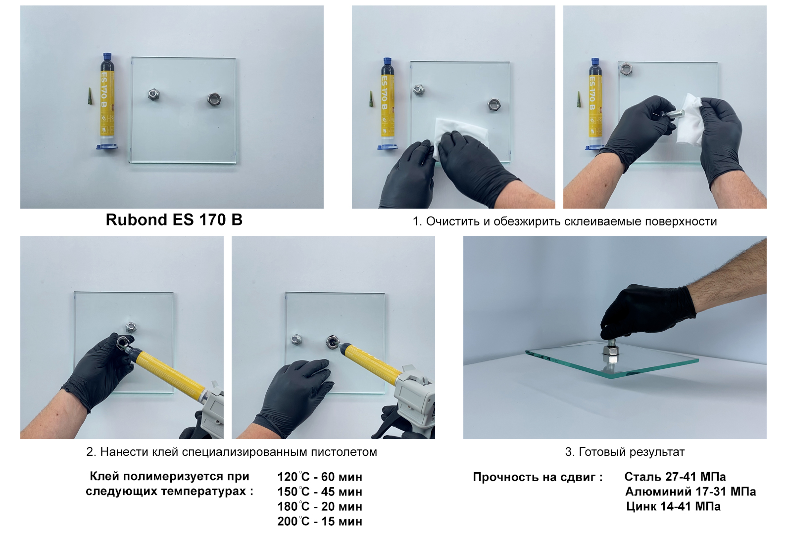 RuBond ES170 B - однокомпонентный эпоксидный конструкционный клей. Жесткий клей, отверждаемый нагревом, при отверждении не растекается и способен склеивать материалы с зазором до 5 мм. Диэлектрик. Композиция обладает повышенными прочностными характеристиками, предназначена для формирования прочного клевого соединения и позволяет заменять такие традиционные системы скрепления деталей как болтовое, клепочное, паяное, сварное, хомутовое и т.д. Продукт обладает отличными адгезионными свойствами и пригоден для склеивания различных материалов, таких как: черные и цветные металлы, ферриты, керамик, стекло, композиты, бетон, искусственный камень, почти все пластики (за исключением полиолеэфинов, ПТФЭ и силиконов).