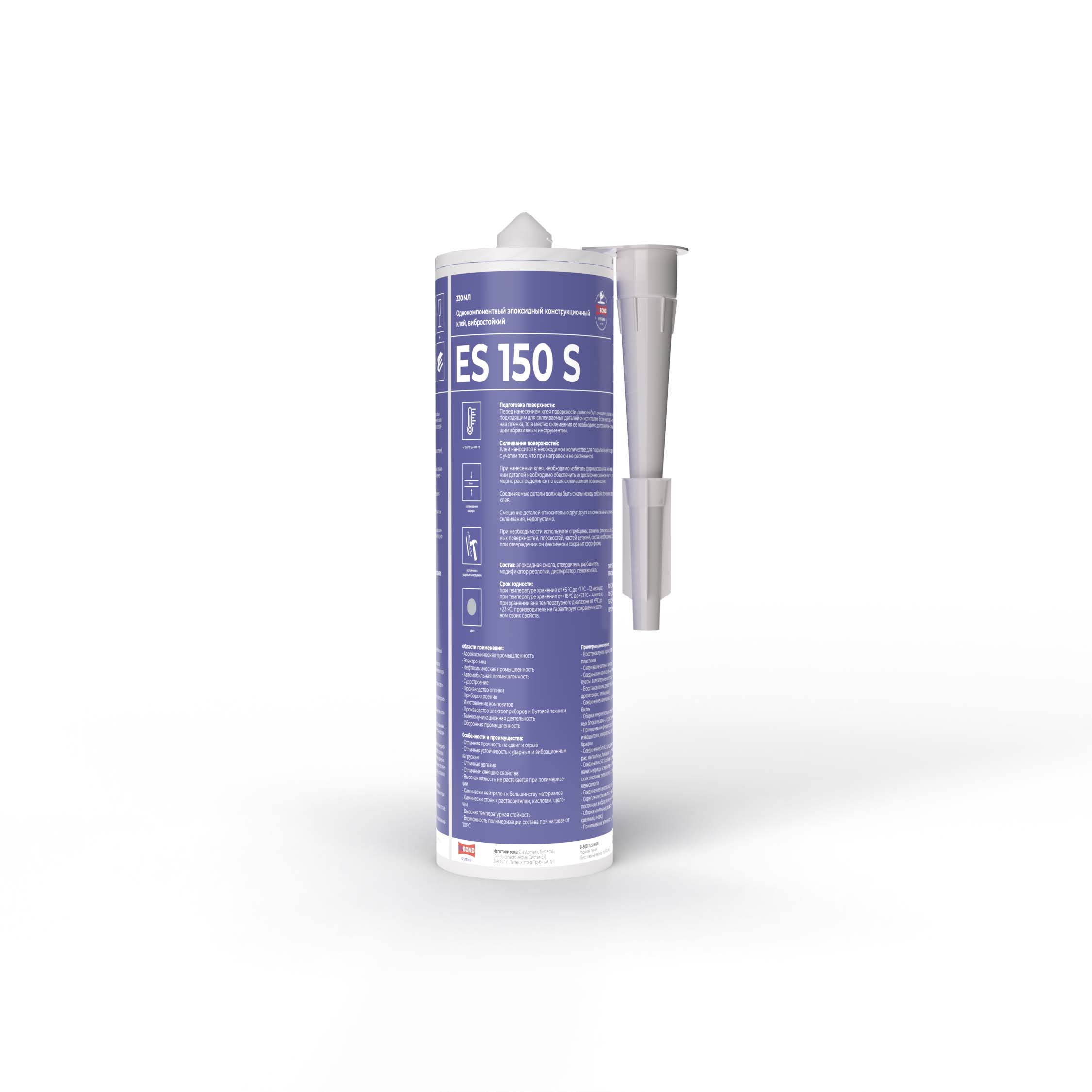 RuBond ES 150 S – жёсткий клей, отверждаемый нагревом, стойкий к вибрации и ударным нагрузкам, при отверждении не растекается, способен склеивать материалы с различным тепловым расширением и зазором до 3мм. Композиция обладает улучшенными прочностными характеристиками, с максимальной устойчивостью к вибрационным и ударным нагрузкам, предназначена для формирования прочного клеевого соединения и позволяет заменять такие традиционные системы скрепления деталей как болтовое, клепочное, паяное, сварное, хомутовое и т.д. Продукт обладает отличными адгезионными свойствами и пригоден для склеивания различных материалов, таких как: черные и цветные металлы, ферриты, керамика, стекло, композиты, бетон, искусственный камень, почти все пластики (за исключением полиолеэфинов, ПТФЕ и силиконов).