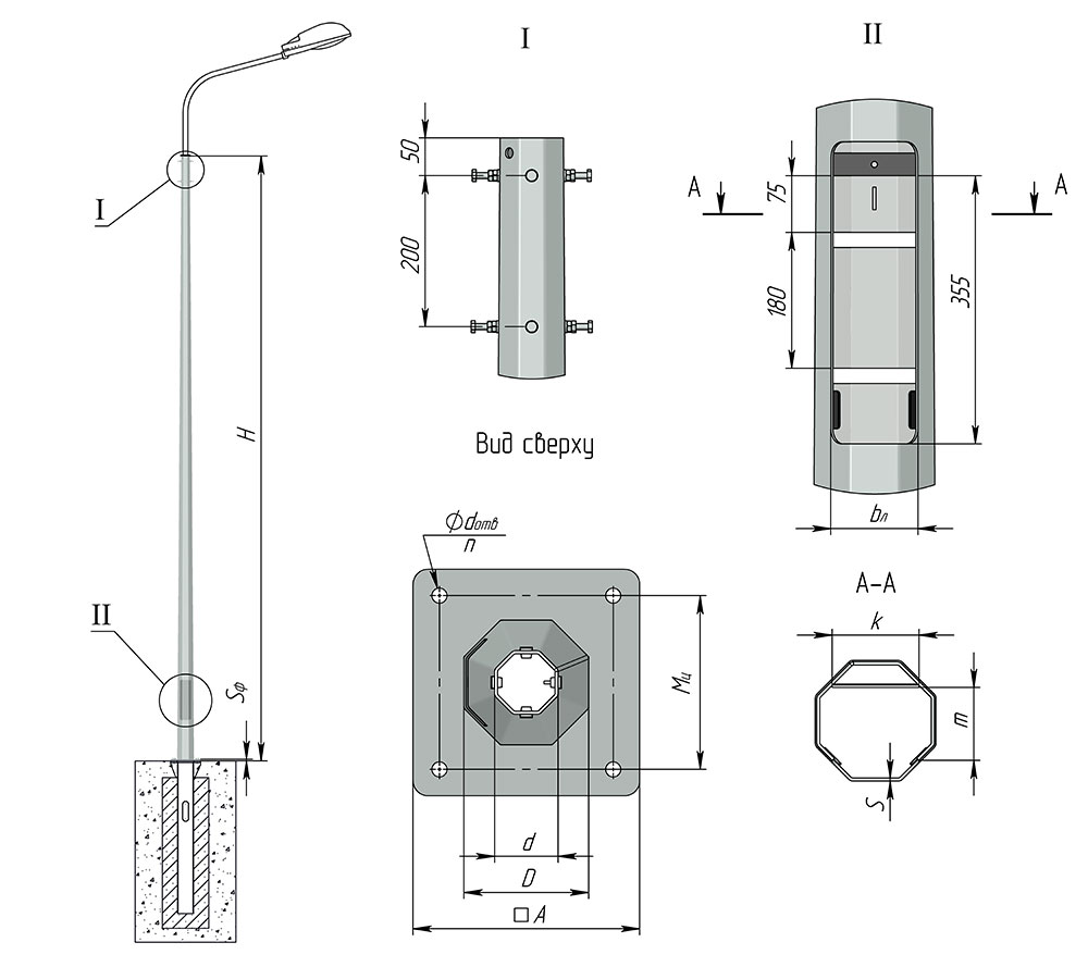 Опора освещения ОГК-10 монтируется на фланцевое основание с помощью резьбовых крепежных деталей метизов (болты, шпильки, гайки, шайбы), и требуют подготовленного фундамента при установке. ФМ заглубляют в бетонное основание фланцевой частью к верху. Возможен монтаж без фланца – при условии, что величина заглубления будет 2 м и более (для общей длины в десять метров).