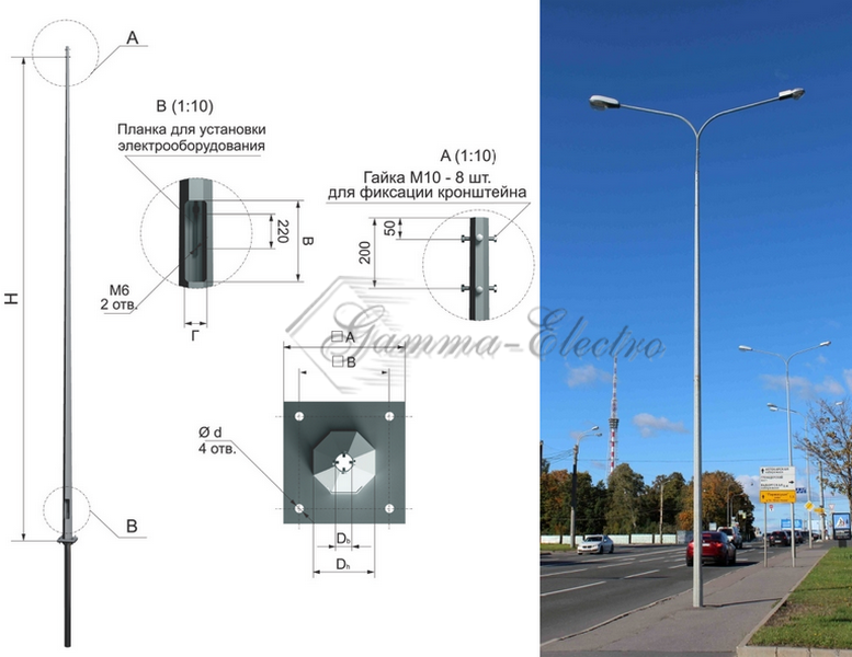 Для изготовления граненых конических опор используется листовая сталь, сгибаемая для придания нужной конфигурации и диаметра. Сварные швы расположены продольно, а защита поверхности от коррозионных воздействий обеспечивается цинковым покрытием. Осветительные приборы на опоре устанавливаются при помощи кронштейнов с разным количеством рожков, которые вставляются в специальное отверстие и держатся на кольце, стягиваемом шпильками. Элементы крепления также оцинкованы.