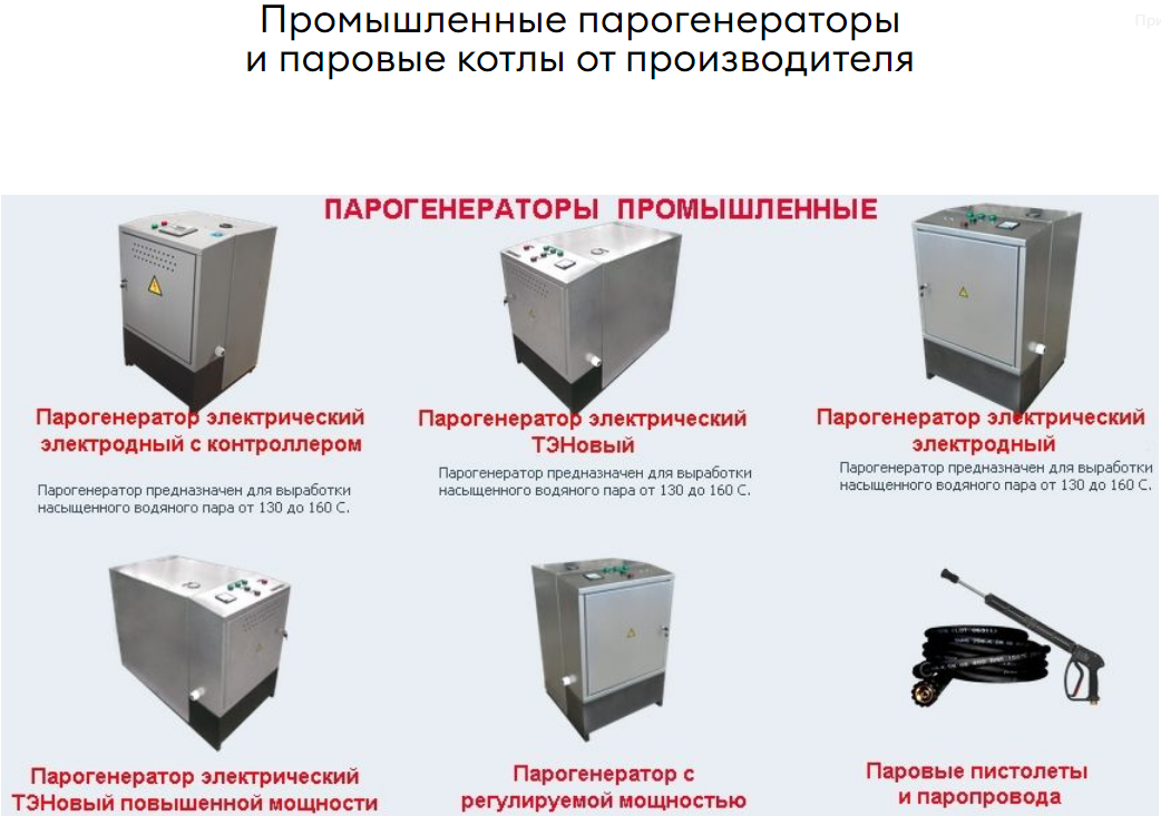 Для получения пара, обладающего необходимой температурой и давлением, служат парогенераторы, которые могут для нагрева воды использовать электроэнергию, газ, твёрдое топливо. Всё зависит от наличия ресурсов на конкретном объекте. Самым главным преимуществом этого теплоносителя при использовании в промышленности является его абсолютная пожарная безопасность и экологическая чистота.