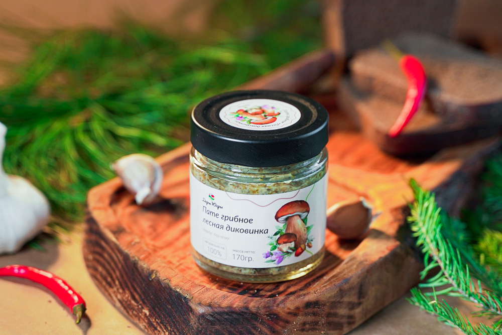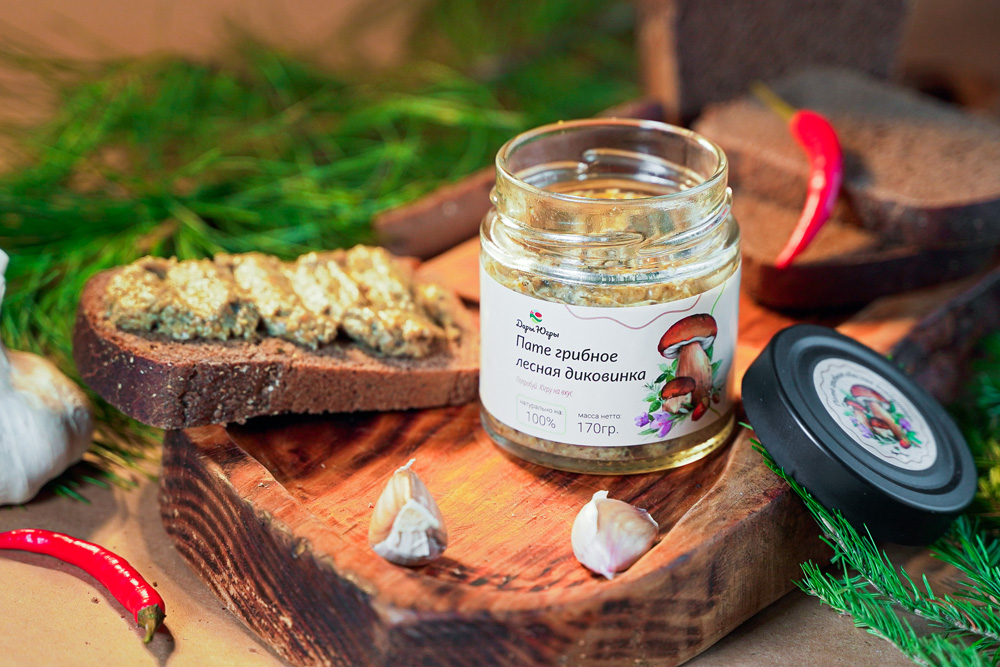 Пате грибное "Лесная диковинка" от компании "Дары Югры". Место сбора дикоросов Ханты-Мансийский автономный округ - Югра. Состав: гриб белый боровой, подосиновик, моховик, грибы белые сушеные, лук репчатый, морковь, кориандр, чеснок, перец, горчица дижонская, соль.