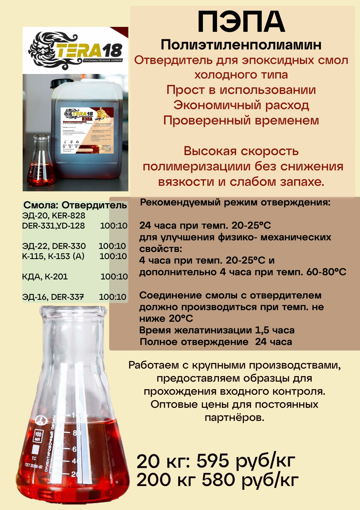 ПЭПА Производитель: Тера-18Город: Ижевск от 580.00 руб. Тера-18 ООО «Тера-18» — российский производитель отвердителей, ускорителей и пластификаторов для эпоксидных смол. Ижевск О товаре Отвердитель для эпоксидных смол холодного типа. Категории Бытовая и промышленная химия Химические товары Прочие химические вещества Последнее обновление 29.04.2026 г., количество просмотров: 1 Сообщить об ошибке Оставить отзыв Чтобы оставить отзыв, требуется авторизация. Имя Ваши впечатления Хорошее Плохое Отзыв Допустимые типы: png gif jpg jpeg webp. Принимаю пользовательское соглашение. Даю согласие на обработку персональных данных. Войдите, чтобы оставить отзыв Ваша фамилия