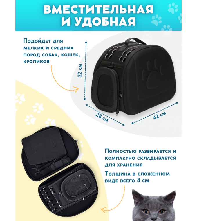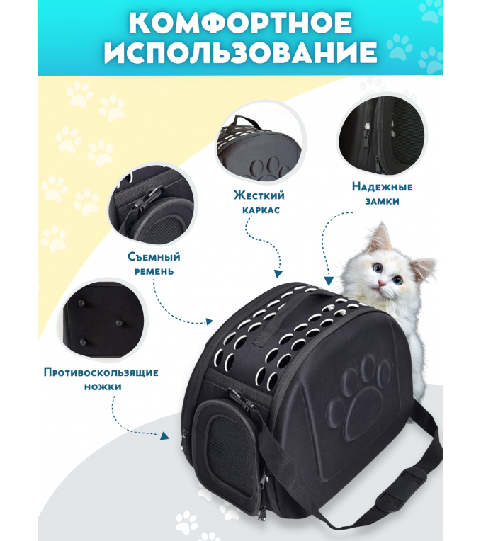 Вав-вав-вав, мяуууу, так будут встречать вас ваши любимые питомцы, если понадобится поехать в ветклинику или полететь на самолете в переноске и, с удовольствием, в нее войдут. Какую же переноску выбрать? Этим вопросом задается каждый любящий хозяин. Наши модели прошли тщательный отбор, ведь у нашей команды есть самые любимые питомцы, которых мы просто обожаем. Мягкая переноска для собак – незаменимый помощник в транспортировке вашего питомца. Изделия выполнены из EVA материала, который обладает рядом преимуществ, такими как: водонепроницаемость, водоотталкивающие свойства, износостойкость, грязеустойчивость, термоустойчивость, высокая прочность, простота ухода, повышенная устойчивость к истиранию нитей. Идеальная переноска для животных: кролик, котята, шиншилла, корги, щенки, собачки, шпиц, кот, грызуны, басик, мелкие породы собак, средние, крупные, большие породы кошек. Большая переноска для самолета, кошачья переноска в сложенном виде очень компактна и не займет лишнего места дома. Процесс сборки и разборки переноски не займет больше минуты: нужно установить среднюю секцию и застегнуть ее на замки. Отличительная особенность переноски бренда mimizoo – универсальность, мобильность и многофункциональность. Сумка переноска для животных легкая и удобная в использовании. Она имеет прочное дно с жестким основанием и прозрачную сетку, которая обеспечивает вентиляцию и светопроницаемость. Материал не создает приятную среду для микроорганизмов, поэтому на нем никогда не встретишь плесень или грибок. EVA активно используют в медицине. Так что ваш питомец в переноске для кошек будет чувствовать себя в безопасности! Прочный ремень через плечо позволит освободить ваши руки. Специальные ножки, расположенные на днище переноски, защищают ее от грязи. !!!!!Для достижения упругости стенок и эластичности материала в составе ткани используются вещества, которые имеют небольшой запах. Из-за этого новая переноска может пахнуть, но это временный эффект - чтобы избавится от запаха переноску нужно проветрить и она больше не будет издавать посторонних ароматов. Все товары имеют размер, поэтому перед покупкой рекомендуем измерить параметры Вашего любимца. В знак благодарности мы вложили подарок - расчёску для Вашего питомца! Купите сумку переноску, и путешествуйте с питомцем комфортно! С теплотой и заботой, бренд Mimizoo