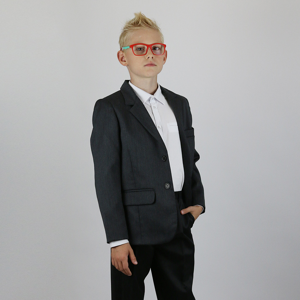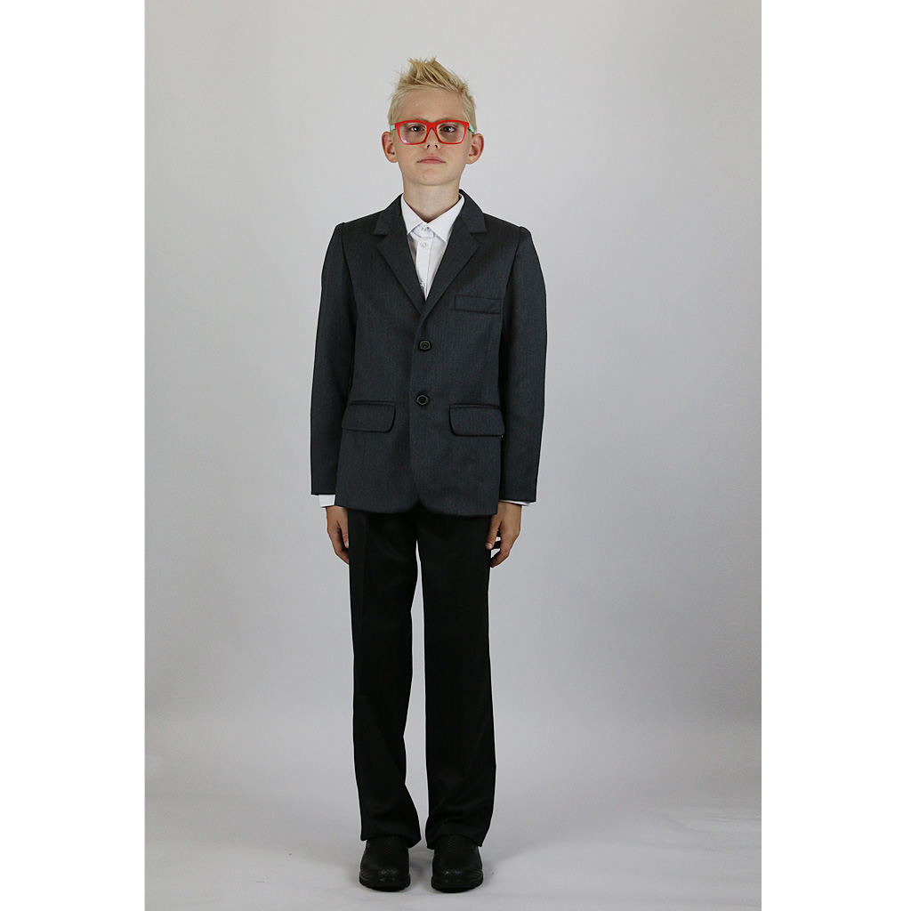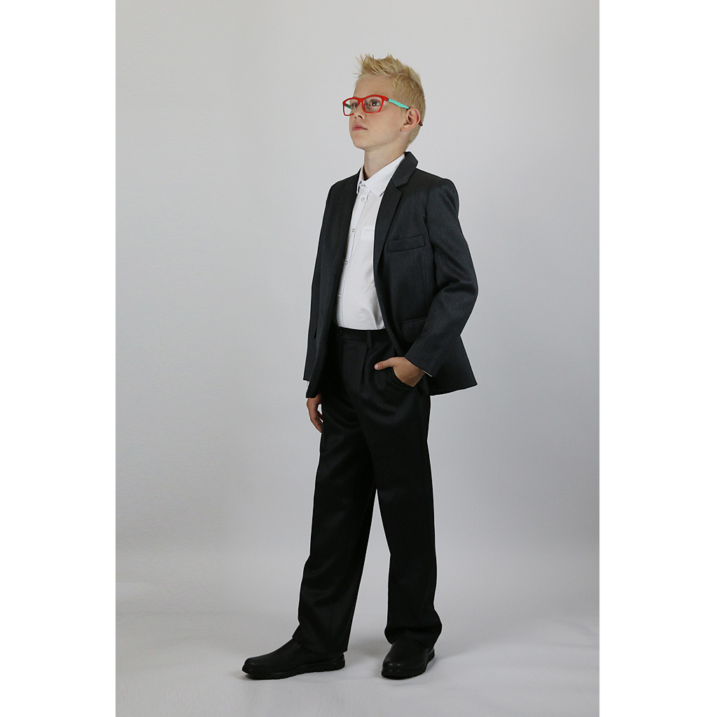 Пиджак для мальчика серый, классический, однобортный, с воротником, с лацканами и прорезными карманами, на подкладке. Рукав двухшовный. На левой полочке пиджака карман с листочкой.