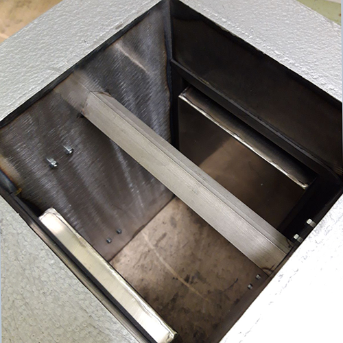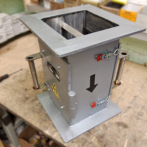 В верхней части магнитного сепаратора (вход сырья) находится рассекатель, который направляет сырье прямо на поверхность магнитной системы, которая эффективно улавливает металлические включения. По желанию заказчика, макгнитная плита может быть оснащена дополнительной гребенкой, которая предотвращает срыв магнитного мусора потоком сырья. Данный магнитный сепаратор эффективно очищает сырье поданное самотеком. Предназначен для установки в трубопроводы прямоугольного сечения.