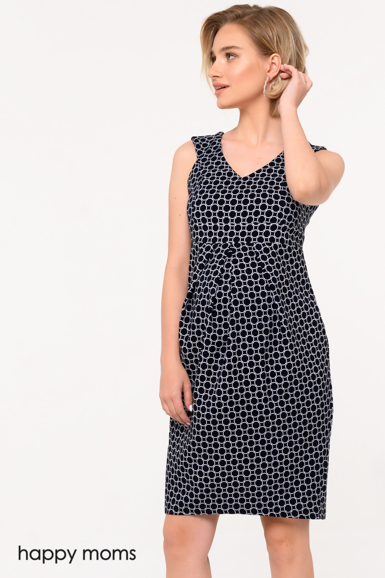 Платье для беременных в черно-белый фантазийный горошек может использоваться в двух вариантах: как сарафан с блузкой или рубашкой и как собственно платье с короткими рукавами. И в том и другом случае образ получится интересным и завершенным. Выразительный рисунок платья дополняется фигурным кроем модели. Элегантный V-образный вырез, необычная геометричная пройма, широкая вставка под линией груди и ярко выделенные складки, дающие объем на животик – все это добавляет модели особенного шарма. Состав ткани подобран более чем удачно. Платье не потеряет формы, будет приятно облегать тело, делая акцент на красивое декольте, шею и плечи своей хозяйки.
