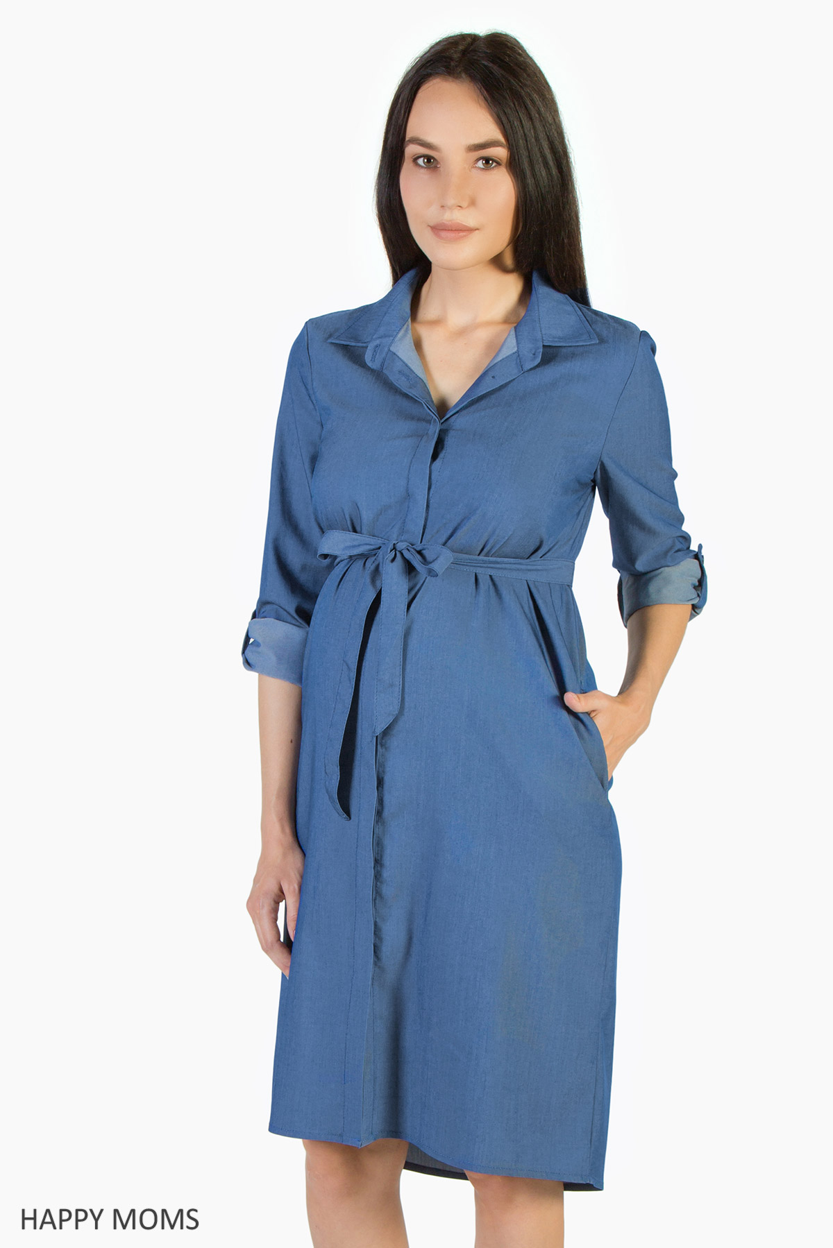 Платье для беременных из тенсела приятного «джинсового» оттенка. Стилизовано под модный в этом сезоне «рубашечный» вариант, имеет лаконичный, полуспортивный крой. Длина рукава регулируется хлястиком, мягкий тканевый пояс может завязываться как спереди, так и сзади. Для удобства будущей мамы имеются прорезные карманы. Объем на животик обеспечивается свободным силуэтом платья, этот же демократичный силуэт позволит носить модель и после родов, корректируя посадку по фигуре поясом или декоративным широким ремнем. Ткань экологичная, дает телу дышать, не вызывает аллергии и проста в уходе.