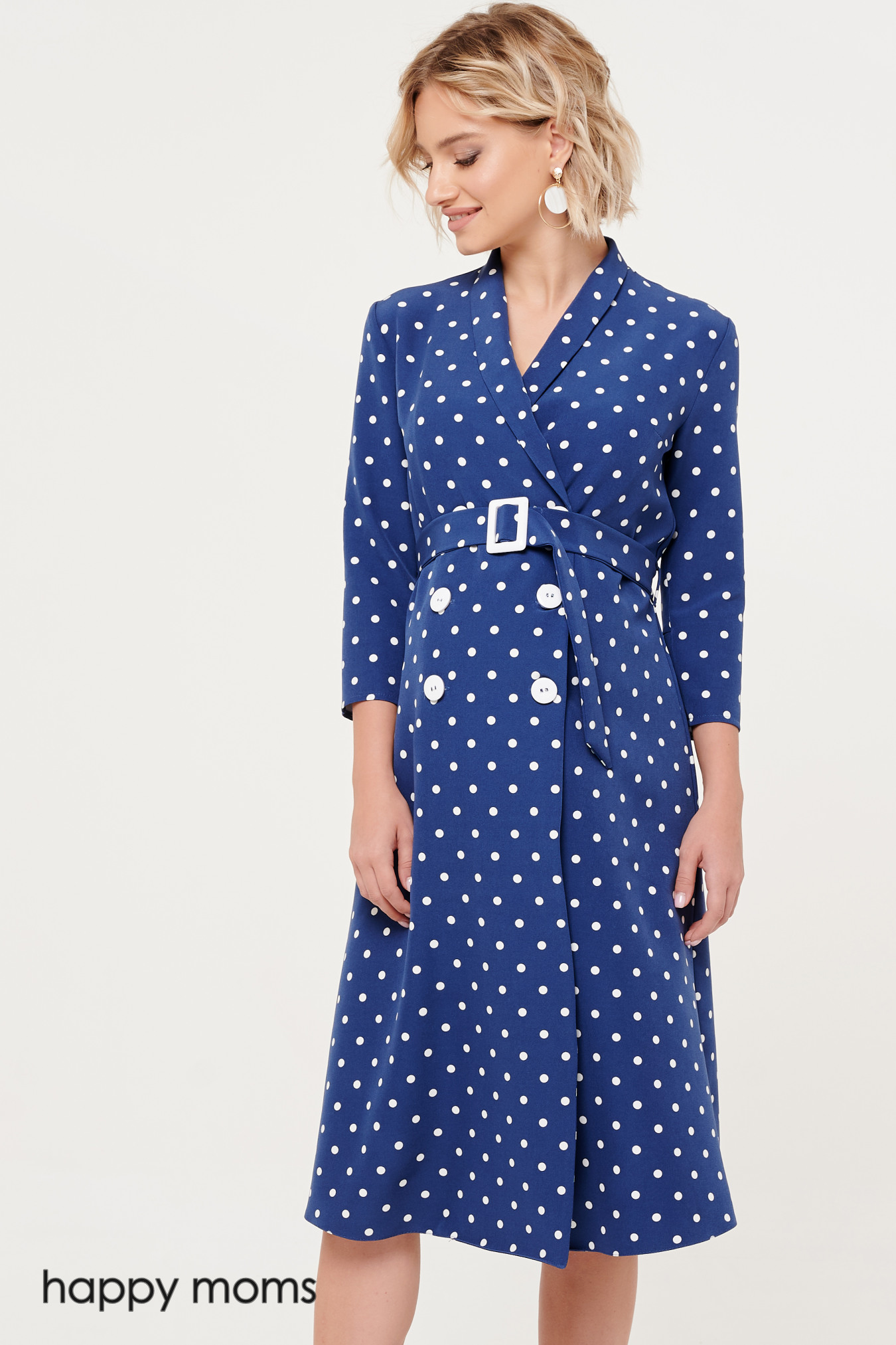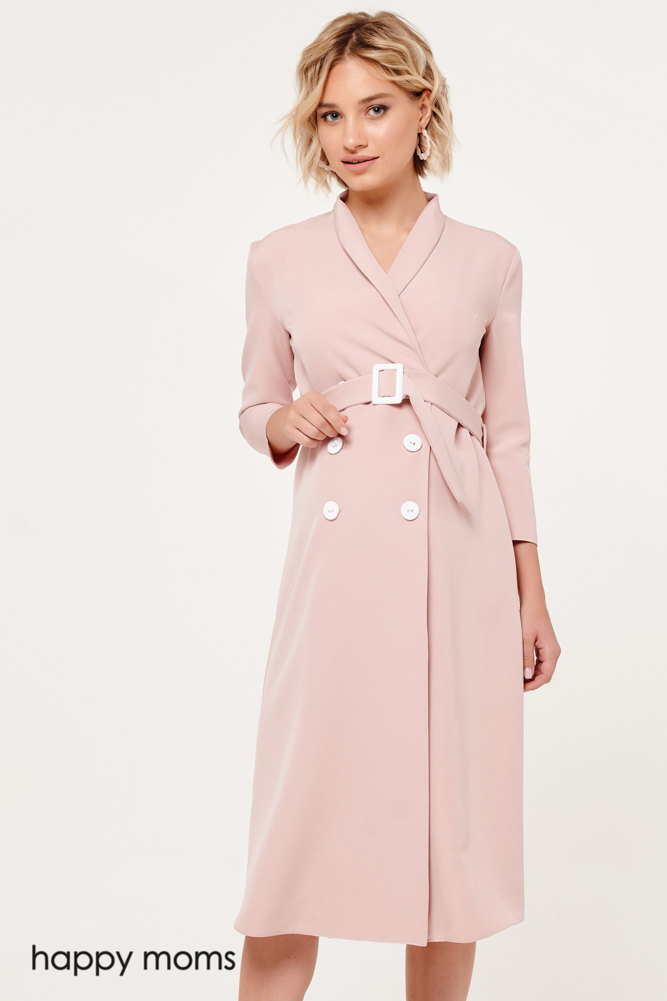 Двубортное платье. Нежность оттенка красиво подчеркивается белоснежной фурнитурой – пряжкой на поясе и пуговицами. Рукава три четверти, аккуратные, с небольшим дополнительным объемом по окату. V-вырез переходит в очаровательную шальку и отлично гармонирует с классической, ниже колен, длиной модели. Роскошный вариант для торжественных выходов, гармонично сочетается с туфлями на высоком ходу, лодочками на шпильках. Дополнения в виде аксессуаров практически не требует, если только совсем лаконичных, поддерживающих, но не перебивающих женственную стилистику платья. Специальный крой дает необходимый объем на животик, поэтому платье можно носить на любом сроке беременности.
