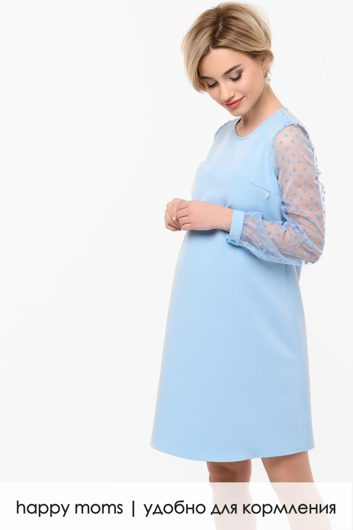 Романтичное коктейльное платье нежно-голубого цвета. Сшито из двух видов ткани: однотонного полотна и прозрачного гипюра, которые великолепно гармонируют. А-силуэт, длина выше колена, элегантная сдержанность в деталях – модель станет отличным приобретением в гардероб модной мамы. Платье может выступать в вечернем варианте – для этого достаточно надеть под него нарядные босоножки или туфли. Или использоваться для элегантного повседневного лука – если подобрать под него лодочки на низком или среднем ходу. И в первом, и во втором случае модель может обходиться без дополнительных аксессуаров – оно самодостаточно в своей изысканности. В районе груди есть две молнии – они помогут покормить грудничка, не привлекая внимания.