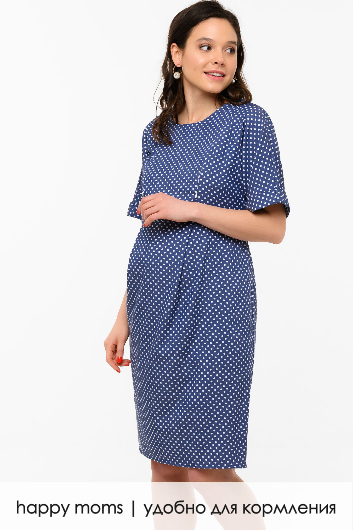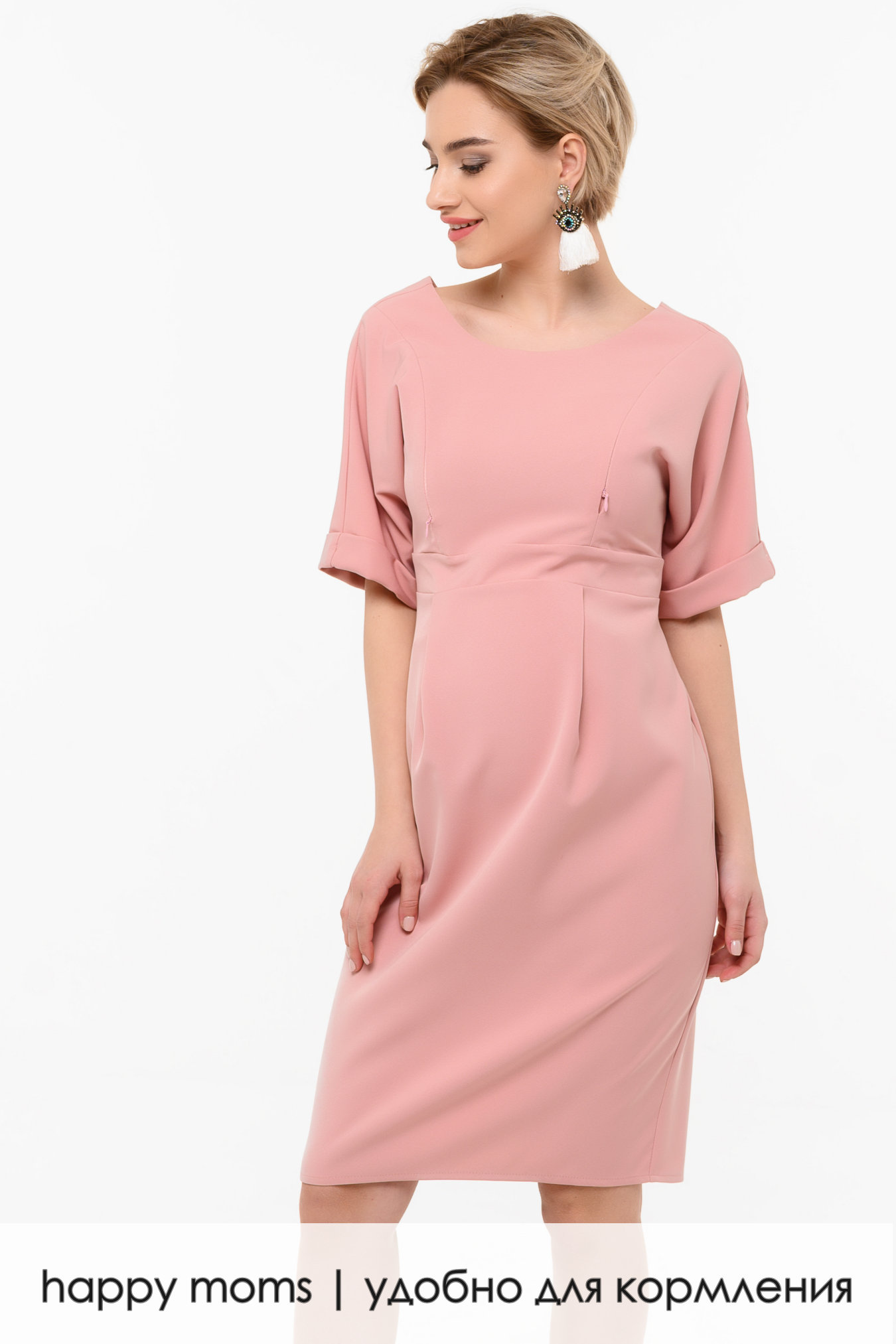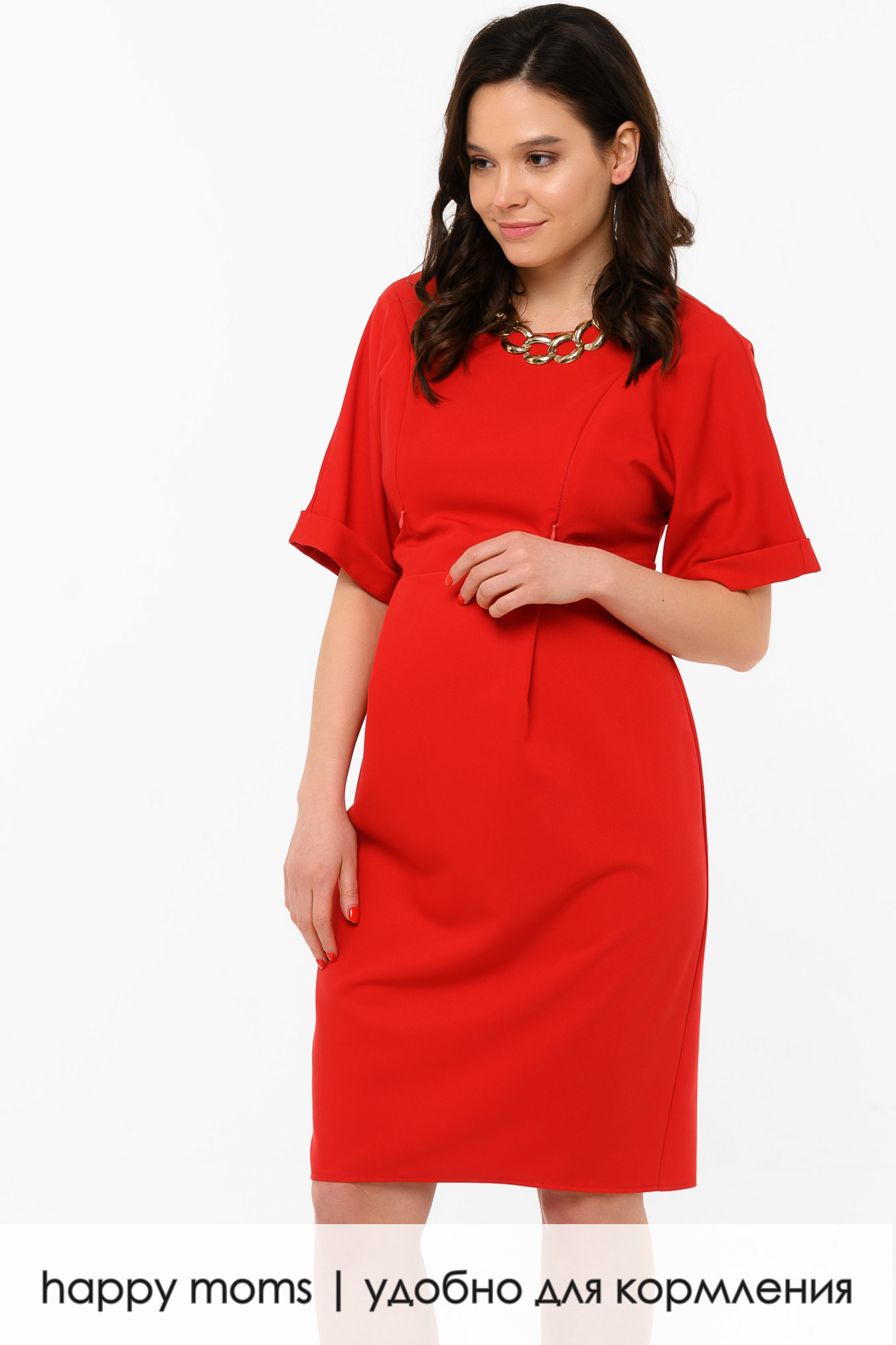 Элегантное платье. Прямой силуэт поддерживается широкими приспущенными рукавами, аккуратным вырезом, меняющим форму сзади, и классической юбкой «карандаш». Талия у модели чуть завышенная, под швом заложены небольшие складки, которые дают простор животику. Сзади у платья небольшой разрез, достаточно широкие, прямые рукава заканчиваются декоративными отворотами. Модель подойдет для посещения офиса, если мама еще работает, а после ухода в декрет ее можно носить как повседневный вариант. Обувь к образу подойдет классическая, лучше однотонных оттенков. В качестве дополнительных аксессуаров можно использовать крупную бижутерию и аккуратные классические сумки.